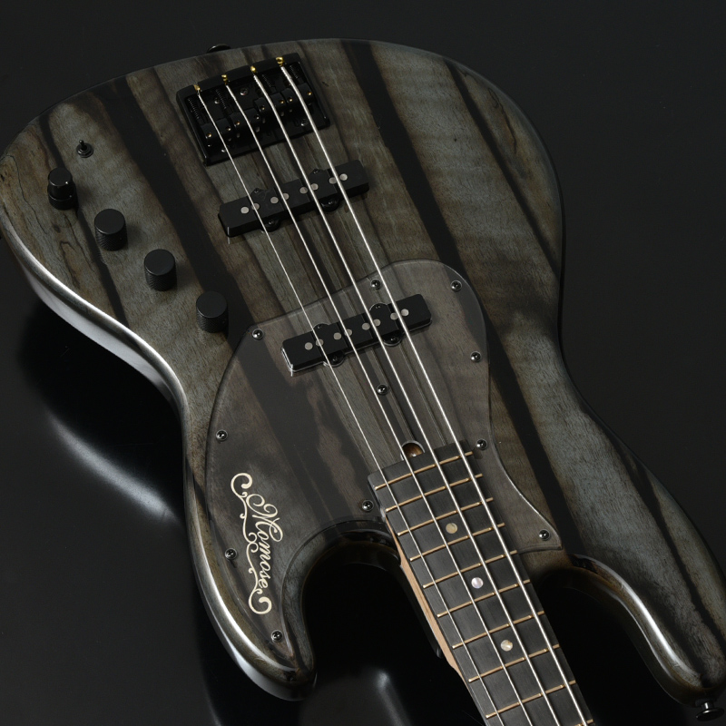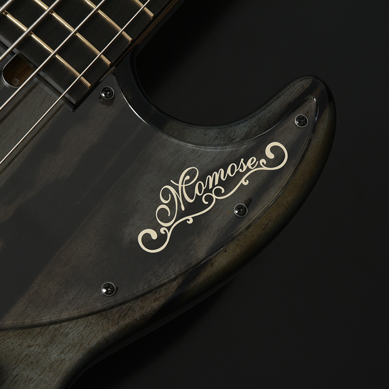 組み合わされるピックガードにはクリアのアクリル素材を使用しているため、全面に黒柿の縞杢を見て取れます。またMomoseロゴをピックガード裏からシルクで入れることにより、さり気なく特別感の高い仕上がりとなっております。