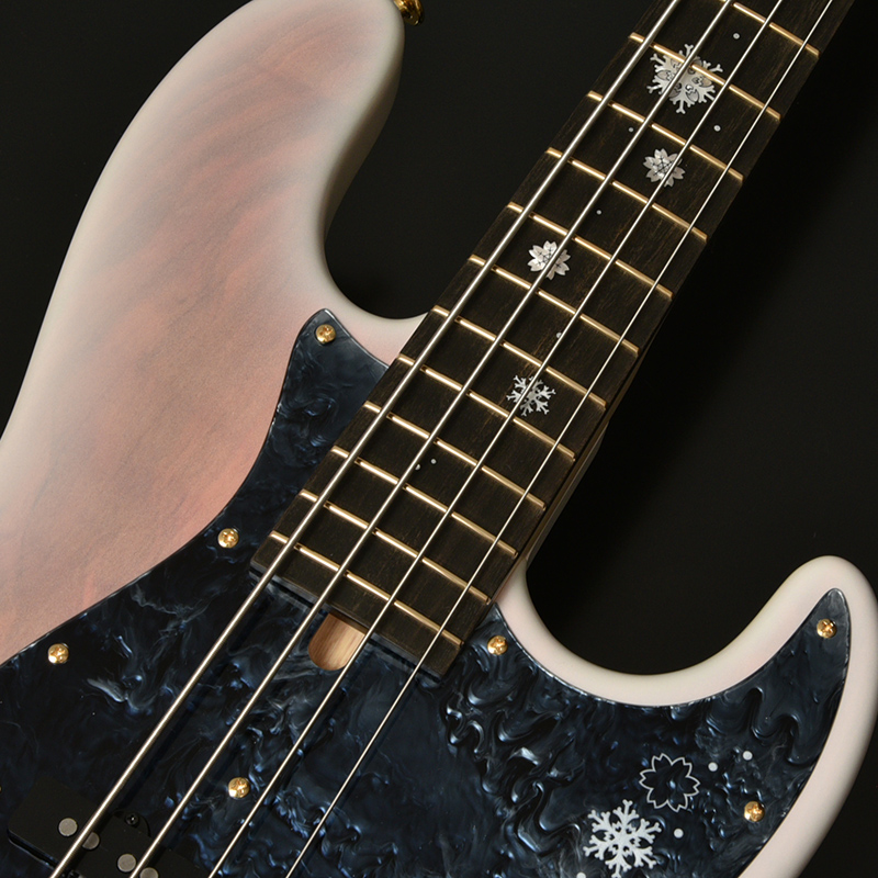 インレイデザインはヘッドトップとピックガードロゴにも及んでおり、共通のデザイン性を持たせることでモデル全体で厳かな冬に咲く桜を表現しております。