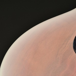 また、ピックガードにも特注した淡いピンクパールの材料を使用しており、ボディ中央部の桜色と見事にマッチングしております。