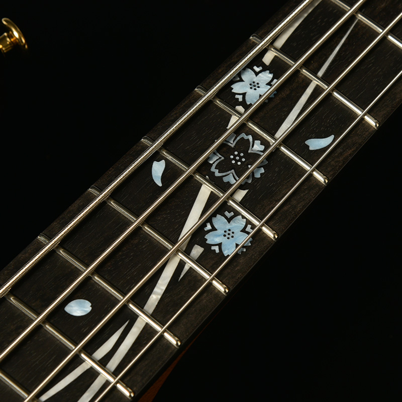 京都を流れる鴨川から着想を得た流れるようなインレイは、氷のような色味のアクリル材を使用することで冬を感じられる仕様に再構築。また、桜ギターのモチーフでもある和傘の女性をピックガードに、桜の枝と花のデザインをヘッド上部に取り入れており、桜ギターとして統一感のある仕上がりとしています。
