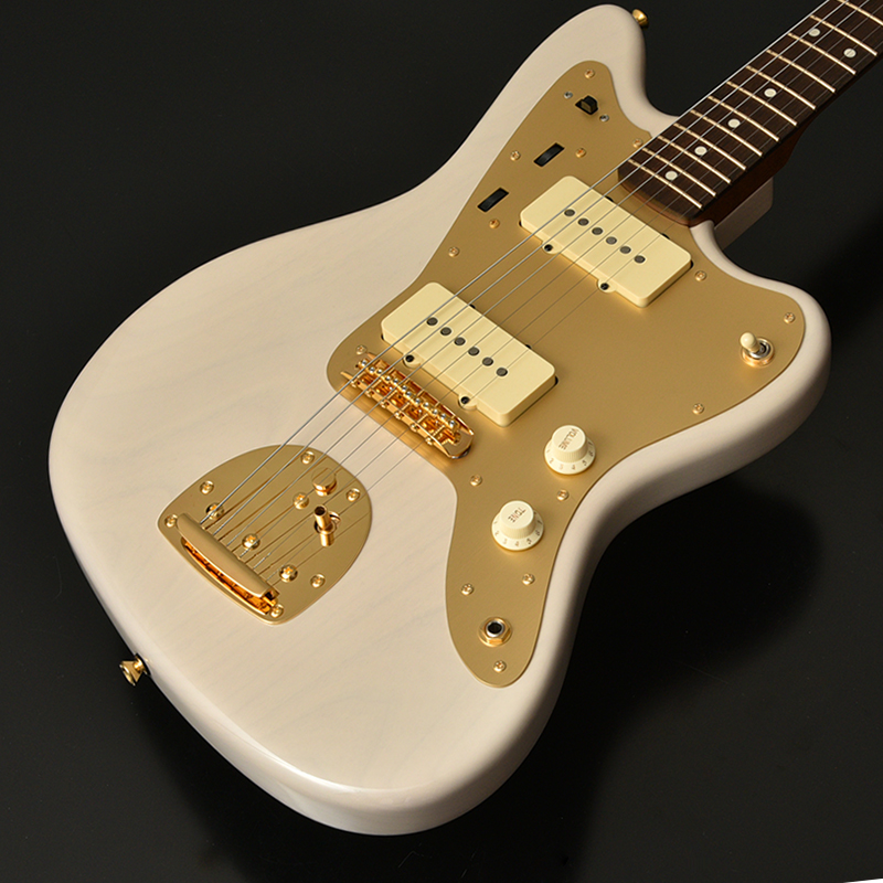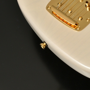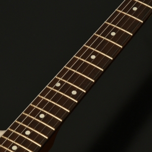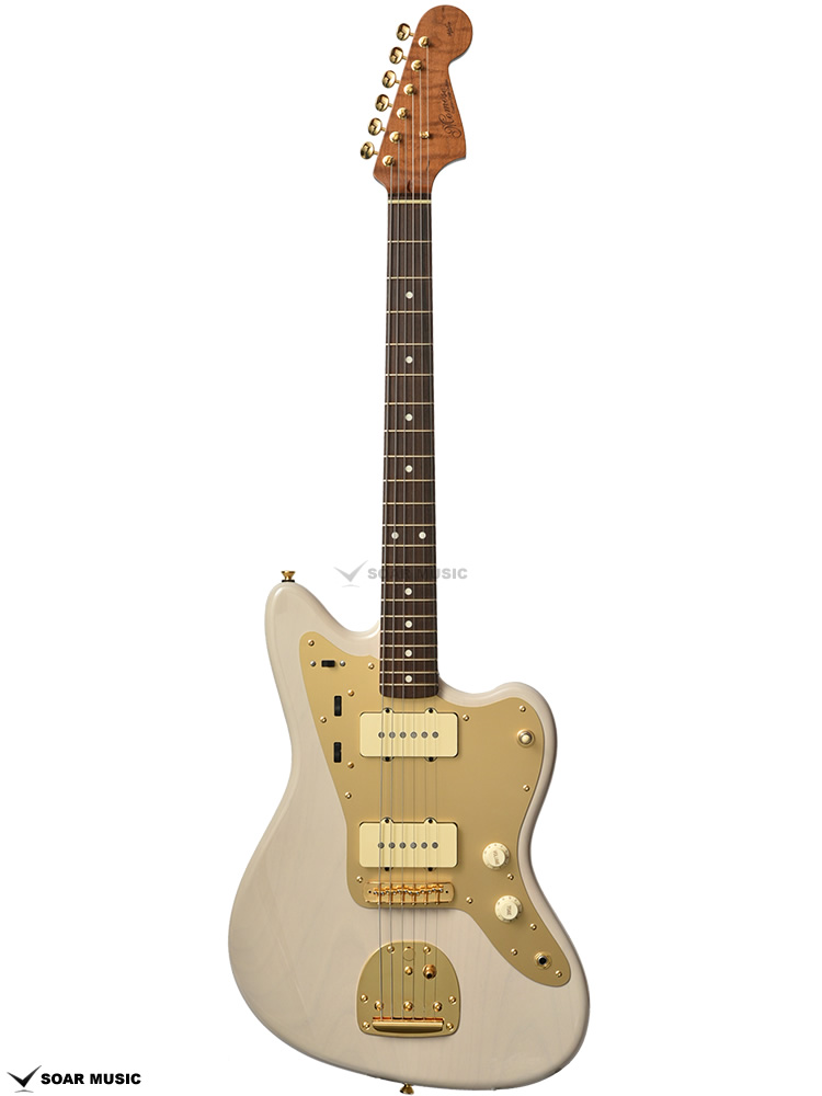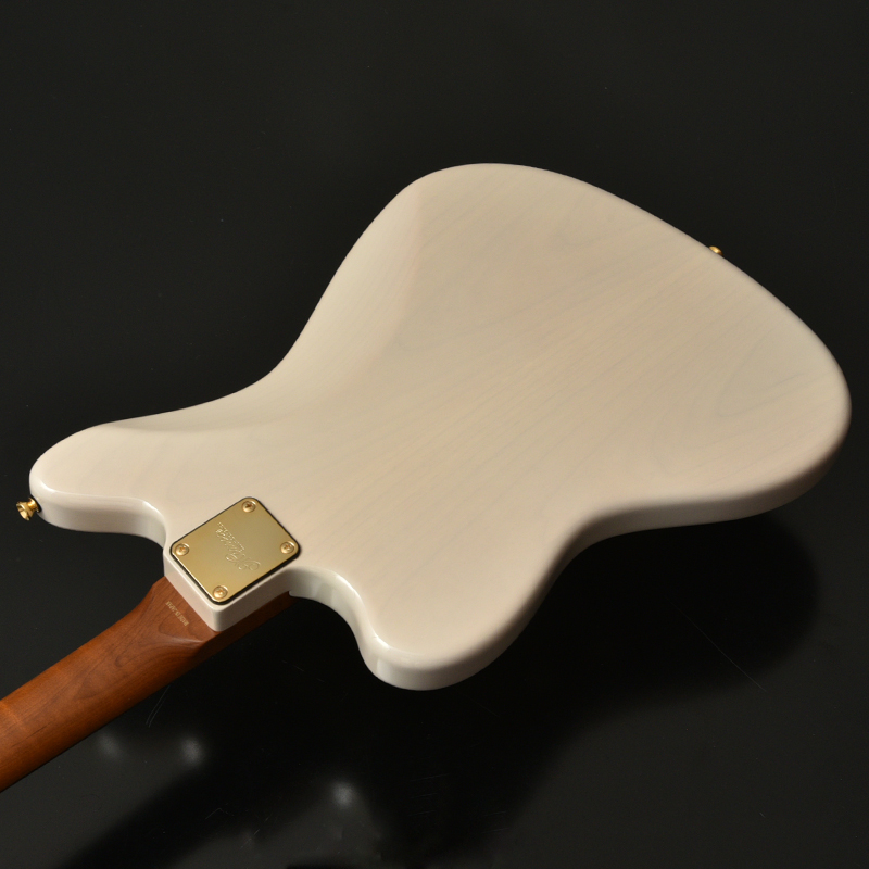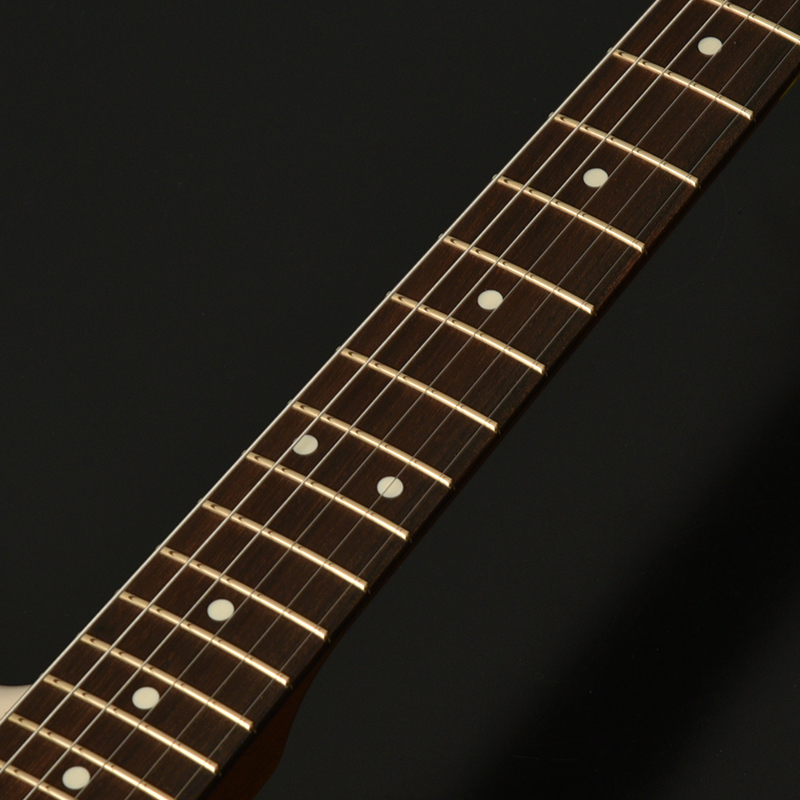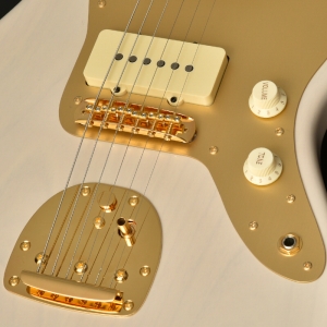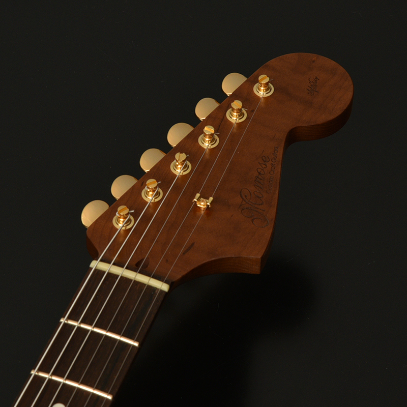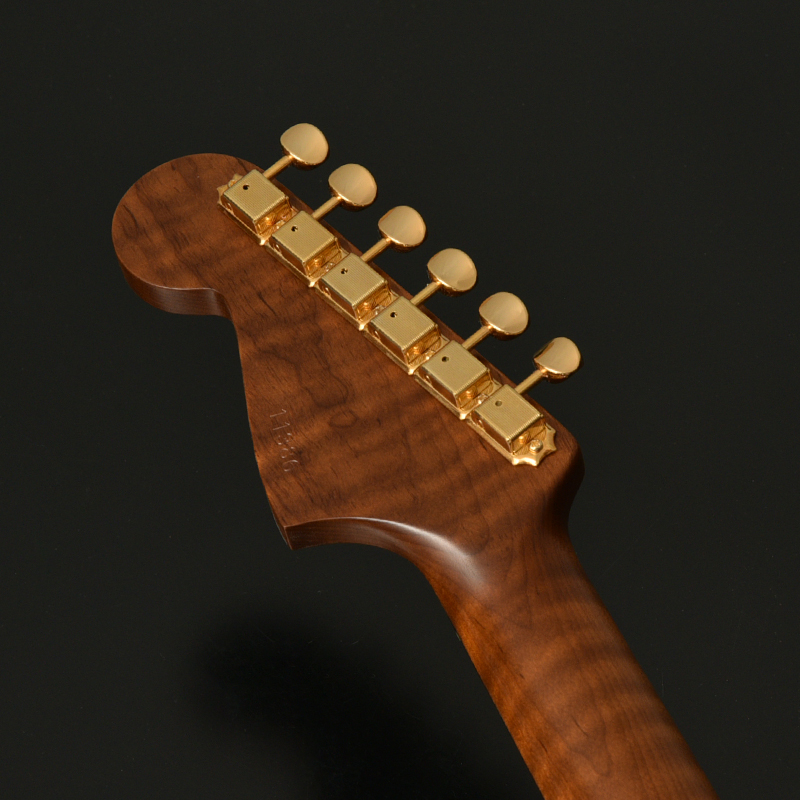 ネックはサーモ加工を施されたフレイムメイプル に Jescar Evolution Gold と外観の美しさと完成度の高さがうかがえます。アノダイズドピックガード、ゴールドハードウエアが高級感を漂わせています。ピックアップはもちろん MOJOTONE を搭載しています。ヴィンテージスタイルながらサーモ加工や、ゴールドフレットなど主張が多い特別仕様です。