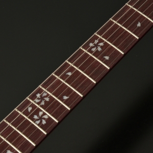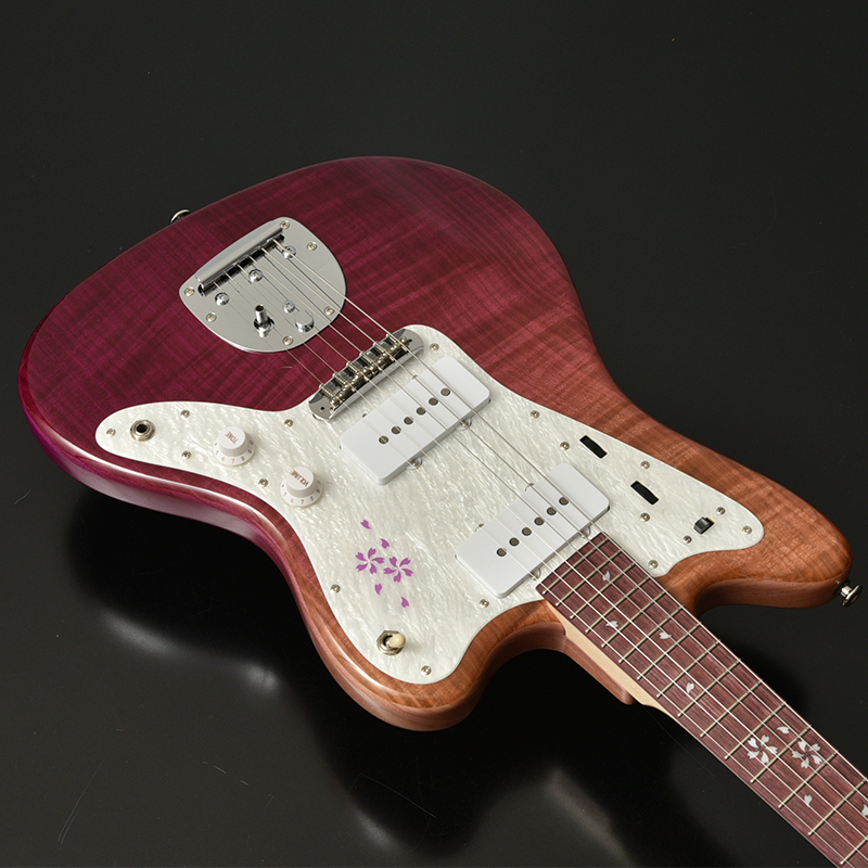 パープルハート材の指板だけでなくヘッドやピックガードにも桜のインレイをあしらった和テイスト溢れるモデルです。