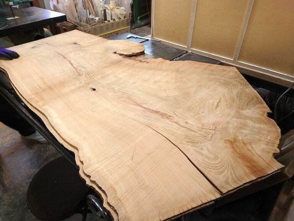 Momoseで使用した枝垂れ桜は特有の淡く揺らぐ杢目とスポルテッド杢が共存しており、数多の桜材を扱ってきた飛鳥工場の職人も珍しいと口にします。