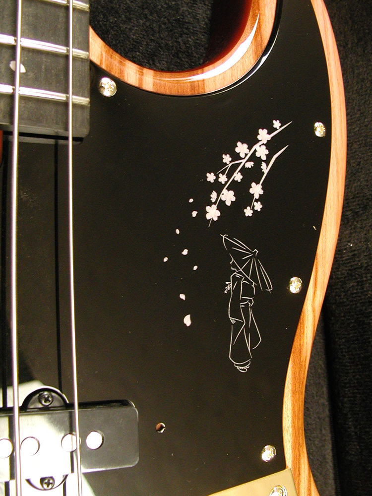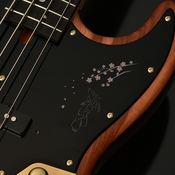 ブラックアクリル素材のピックガードには桜モデルのテーマとなっている「和傘の女性」と枝垂れ桜をデザイン。