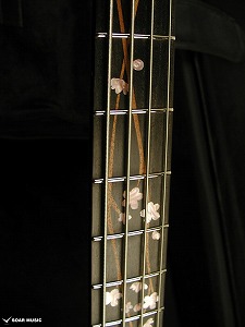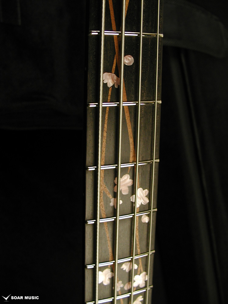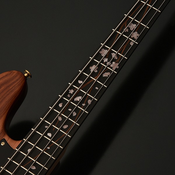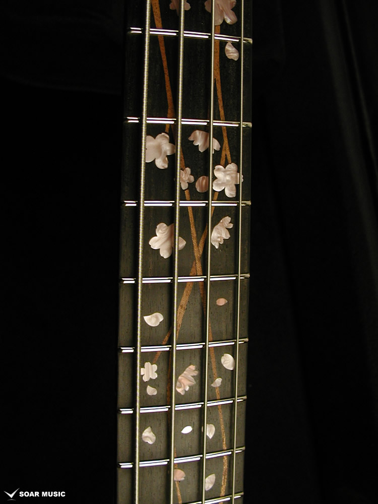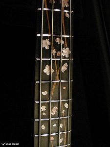 指板全体を使いながら、ツリー・オブ・ライフの如く枝垂れる枝をウッド素材で表現し、アクリル素材で花びらの透明感を演出しながら舞い散る様が表現されています。
