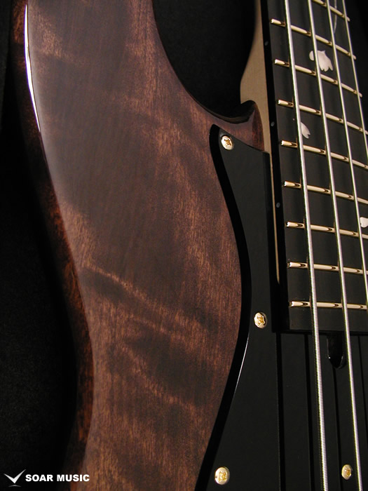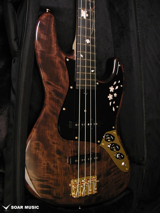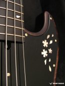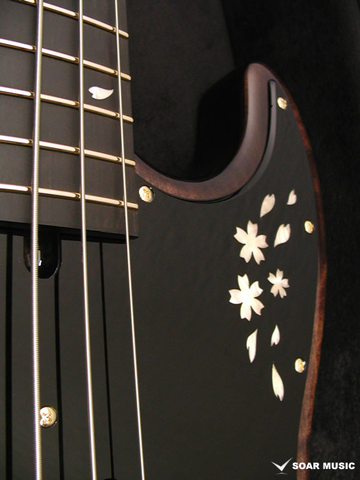 SAKURA: 飛鳥工場で使用される和材のなかでも特に人気の高い「桜」。現在ギター業界には馴染みが薄いかとおもいますが、歌舞伎に使用される小鼓や琵琶の胴など古くから楽器に使用されてきました。材質は粘りがあり、適度に硬質。その音は明るく粒の揃った印象を受けます。この度のモデルは夜の月明かりに浮かび上がる夜桜をモチーフとして制作されました。インレイデザインも一新し、上品かつ精悍な印象に仕上がりました。