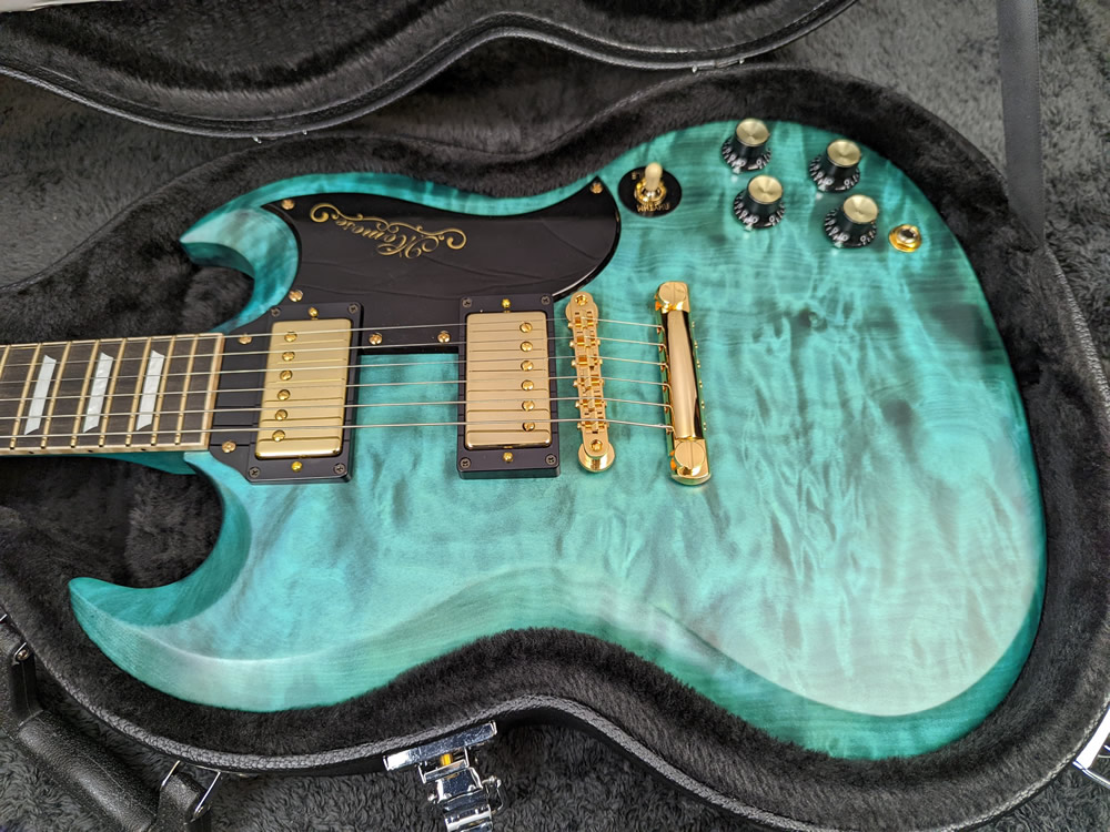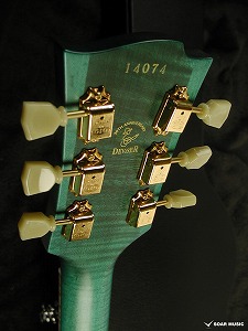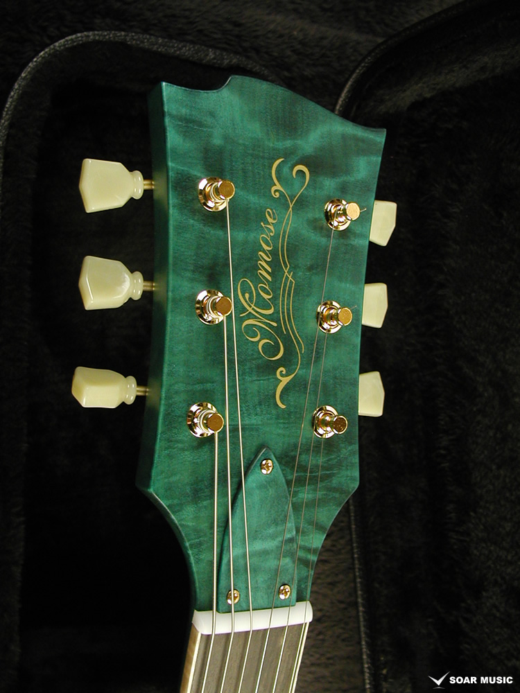 ボディカラーの”Ocean Turquoise Blue”に載せられることで、全体の雰囲気にさらなる深みを与えております。また、ピックガードにゴールドのレジンでMomoseロゴを入れており、ゴールドハードウェアと合わせて特別な高級感を生み出しております。