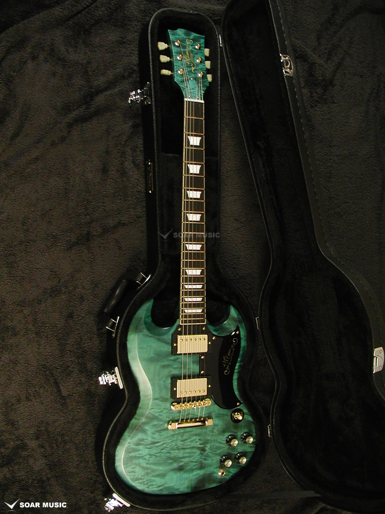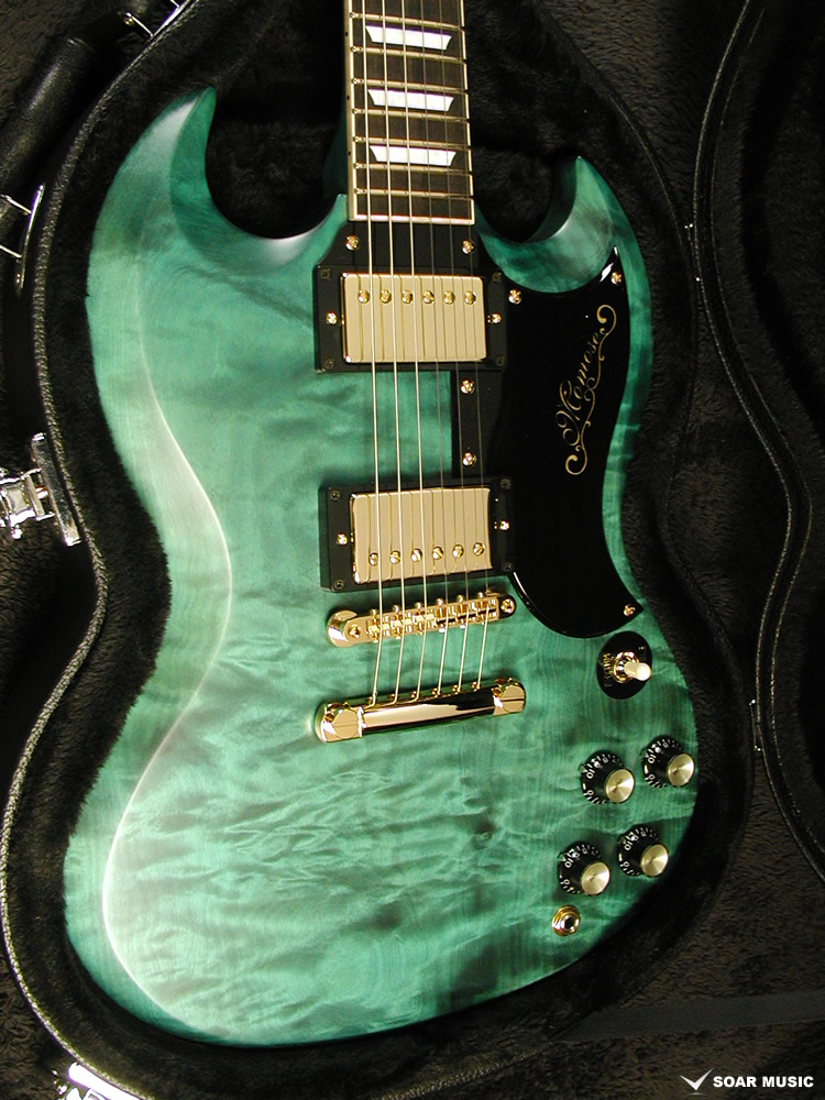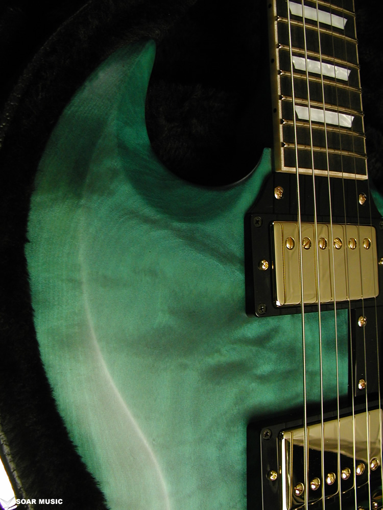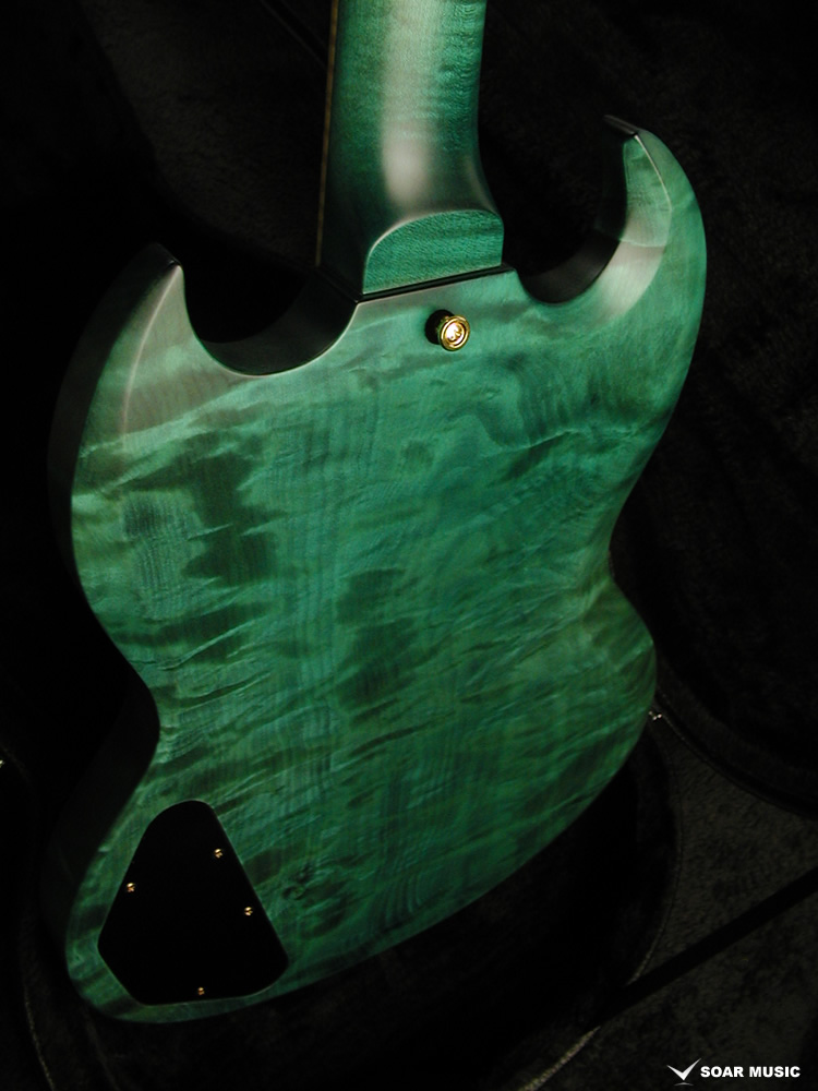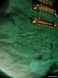 それだけ難易度の高い着色を施し、この神秘的な”青”で仕上げる為に選んだボディ材は、木地の色が白く、海の揺らぎの様なフレイム杢の出たトチ材を贅沢にも1ピースで使用しております。