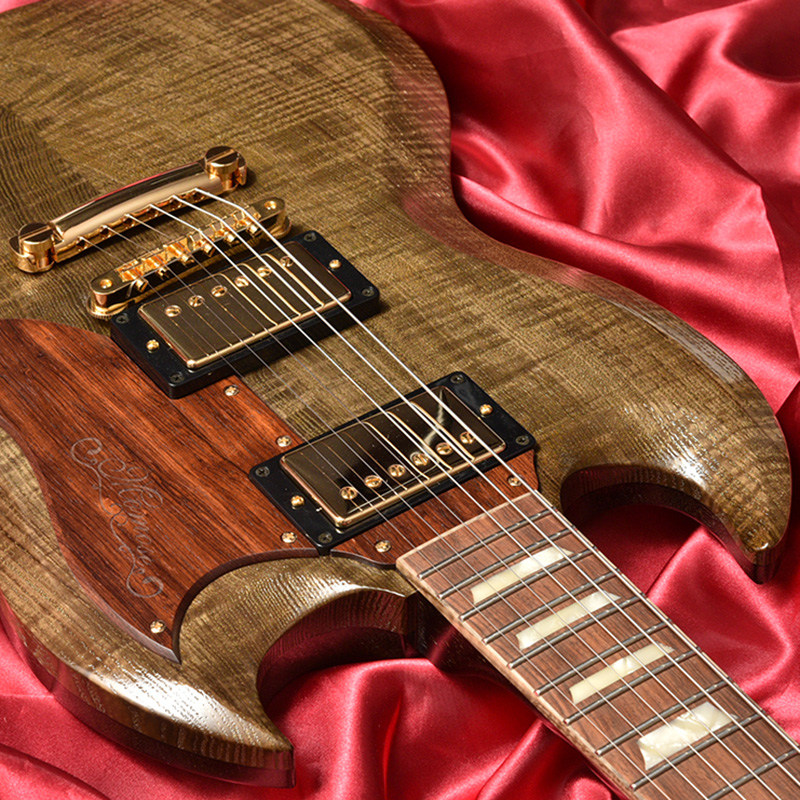 アッシュに近い特性を持つ神代タモをトップに張ることで、そのサウンドにも個性が宿ります。やや緑がかった色味をそのまま生かしたフィニッシュと、「ノンバフ仕上げ」による光沢感のある仕上がりが美しい一本です。