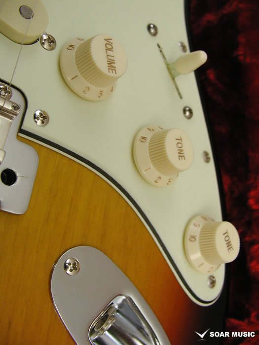 1ボリューム、2トーン、5ウェイ・ピックアッセレクターの一般的な配置ですが、 センターピックアップはトーン回路に配線されておらず、用頻度の高いフロント/リアピックアップで独立したトーンコントロールが可能になるよう配線されています。
