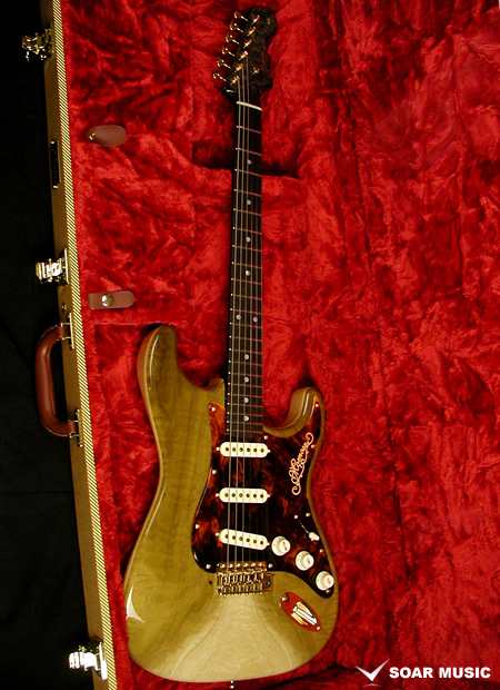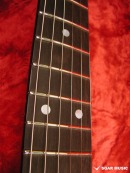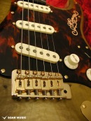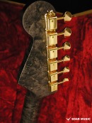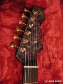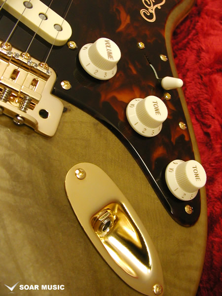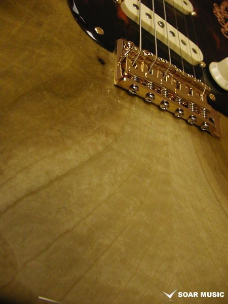 ネックはバーズアイメイプルにエボニー指板を組合わせており、ネック裏のカラーはうっすらと木目が覗くシースルーブラックのサテンフィニッシュで仕上げられており、ボディの杢目、ゴールドパーツ仕様のマッチングで個性を放ちつつも非常に高級感のある落ち着いたルックスです。