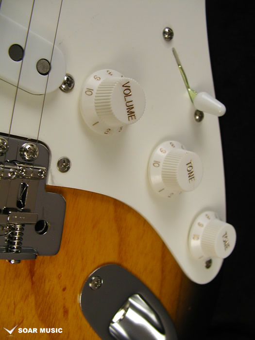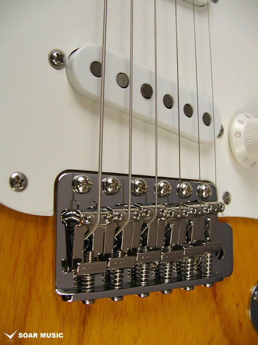 ブリッジにはGOTOH社との共同開発で実現した高い安定性と精度を誇るトレモロユニット「GE108TS」を搭載。ピッチを10.8mmに設定されたスチールプレスサドル、同じくスチール材を使用したインナーシャブロックを使用。ヴィンテージタイプのトレモロユニットながら、アーミングを多用するプレイにおいても高い安定性を実現しています。フレットにはゴールドカラーのJESCAR EVOLUTIONが使用されています。