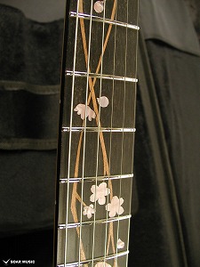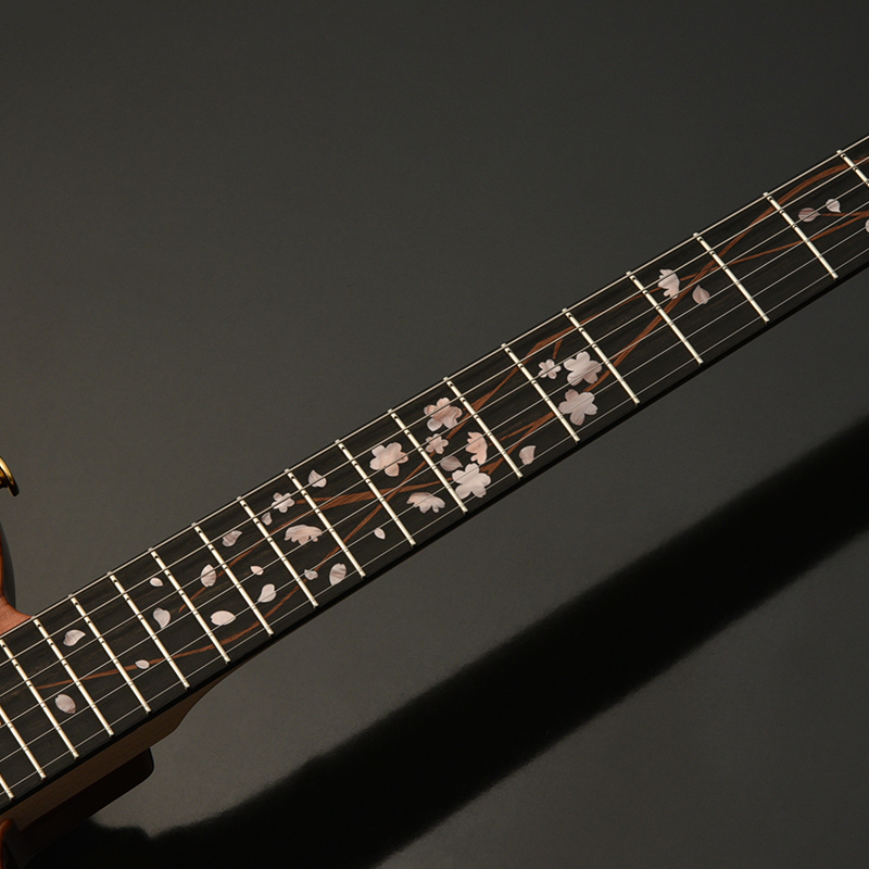 指板インレイのデザインには枝垂れ桜が持つ最大の特徴とも言うべき、垂れ下がる枝とそこに咲く満開の花をデザインしました。