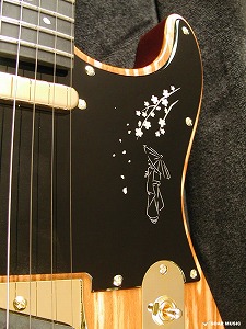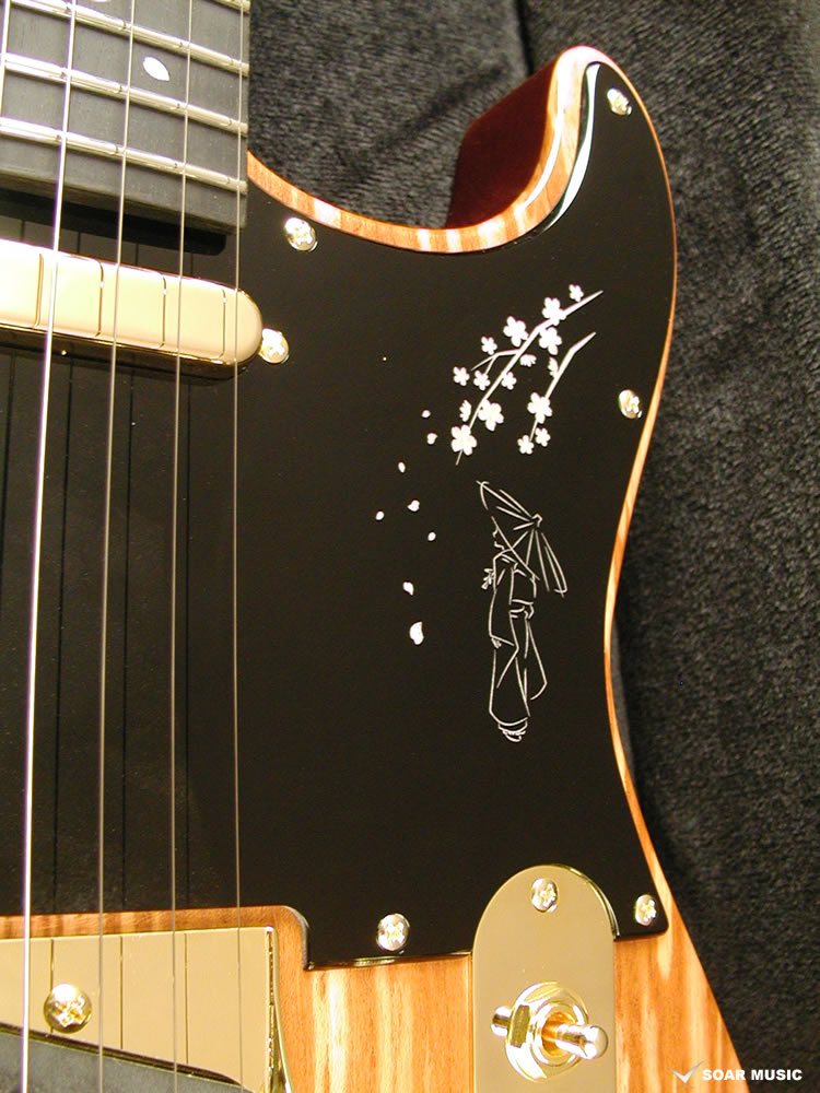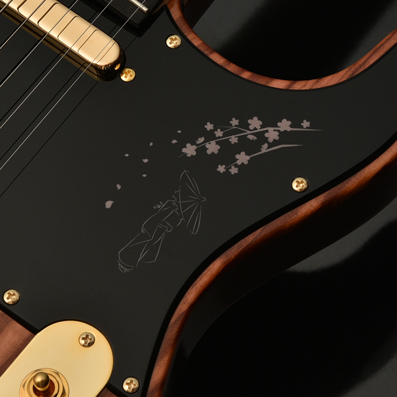 ブラックアクリル素材のピックガードには桜モデルのテーマとなっている「和傘の女性」と枝垂れ桜をデザイン。