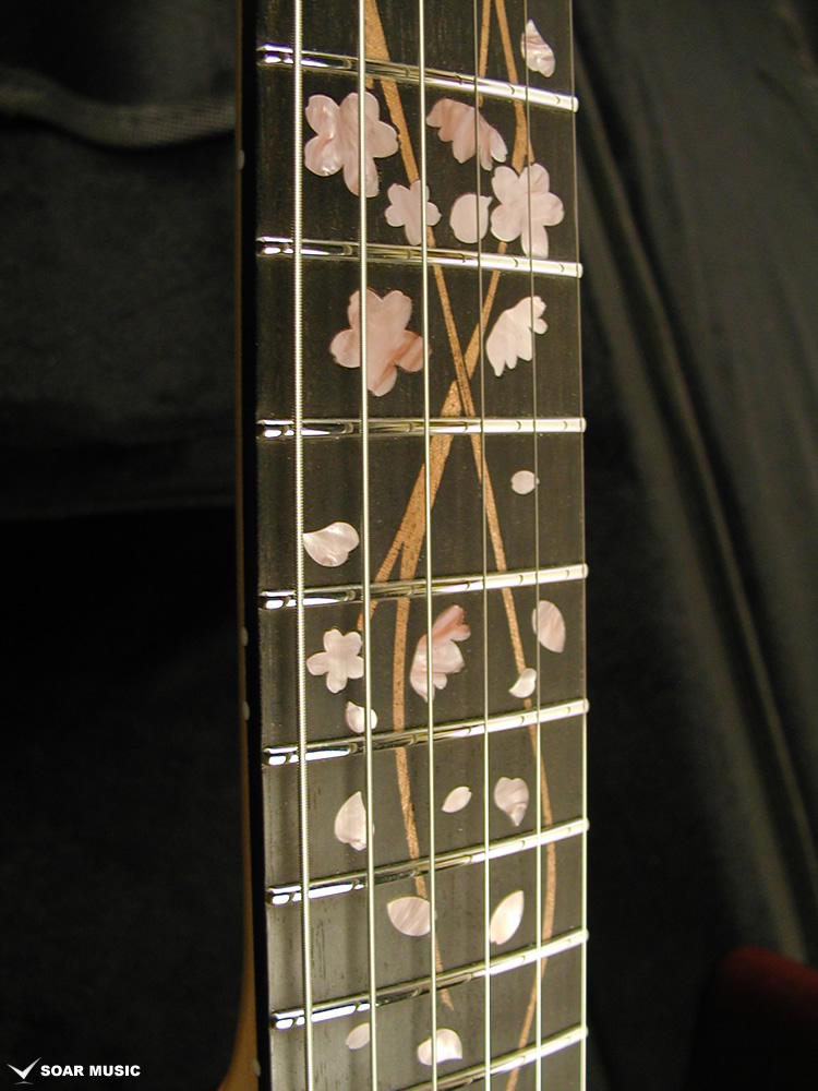 指板全体を使いながら、ツリー・オブ・ライフの如く枝垂れる枝をウッド素材で表現し、アクリル素材で花びらの透明感を演出しながら舞い散る様が表現されています。