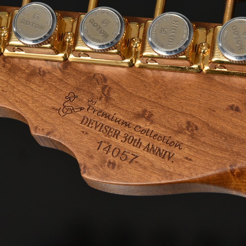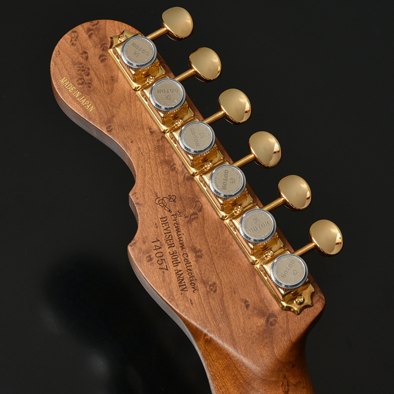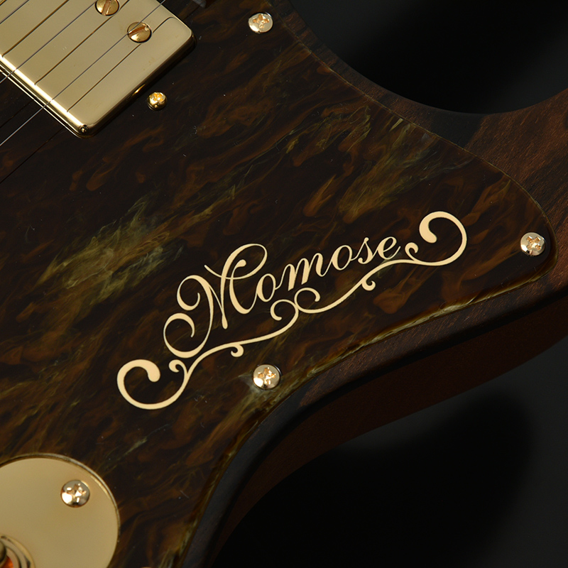 また、組み合わされるピックガードには特注品のダークブラウンからモスグリーンにも見える、こちらもマーブル柄の素材を採用することで、全体での雰囲気をまとめ上げております。