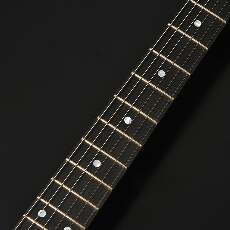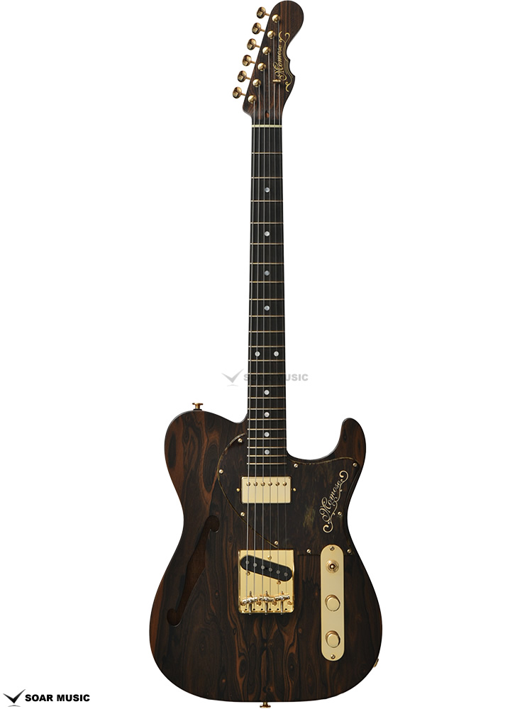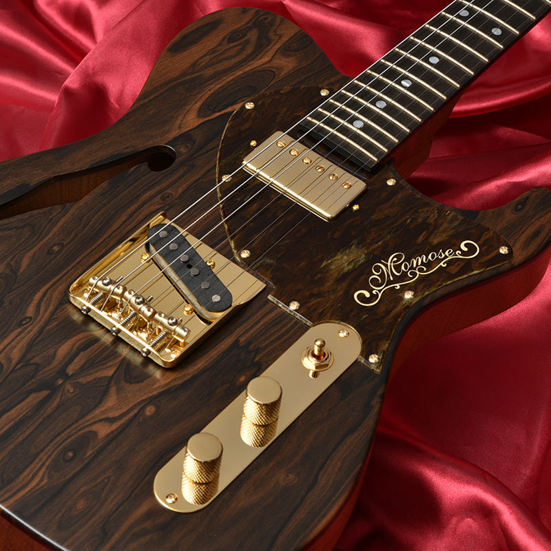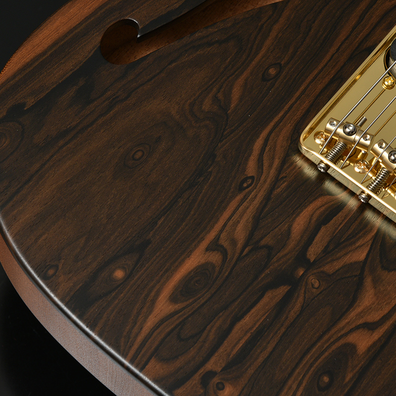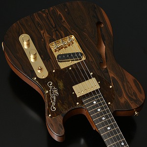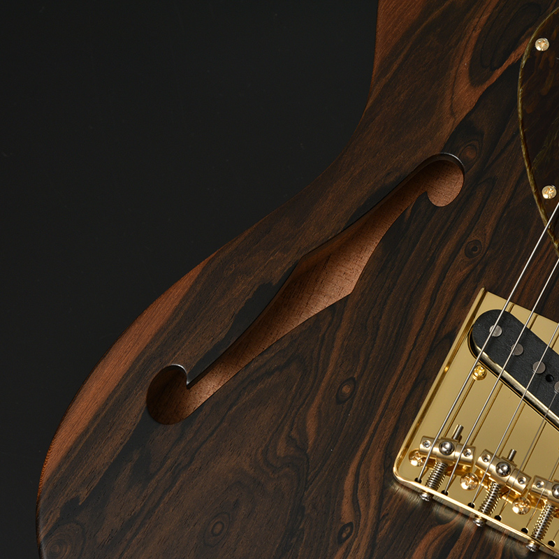 マホガニー材のボディに硬質なジリコテ材をトップ材として組み合わせたことで、マホガニー特有のローミッドサウンドにアタック感が程よく加わっております。さらに本モデルではホロウボディ構造を採用したことでエアー感のある甘いフロントサウンドと軽やかなリアサウンドが魅力です。
