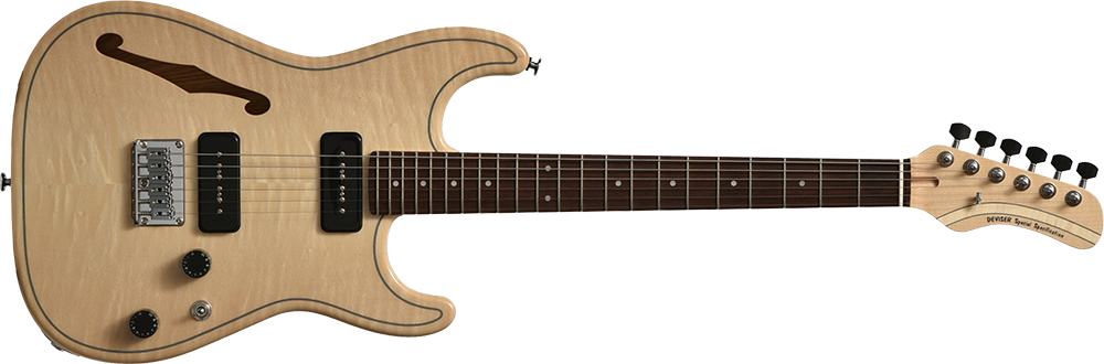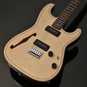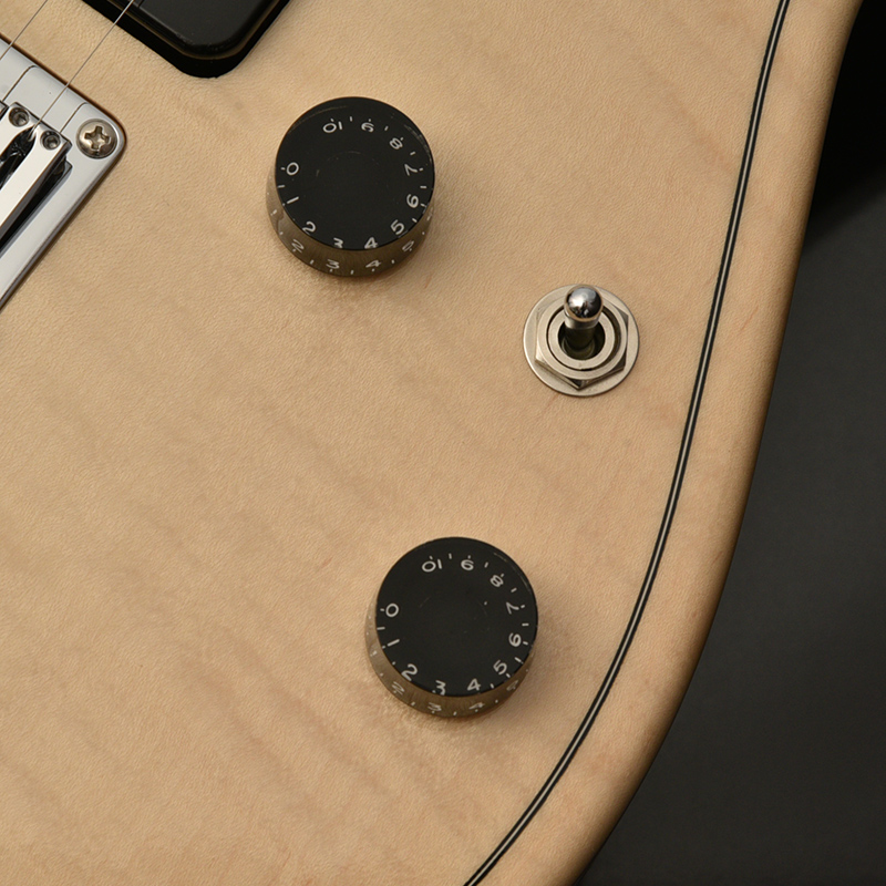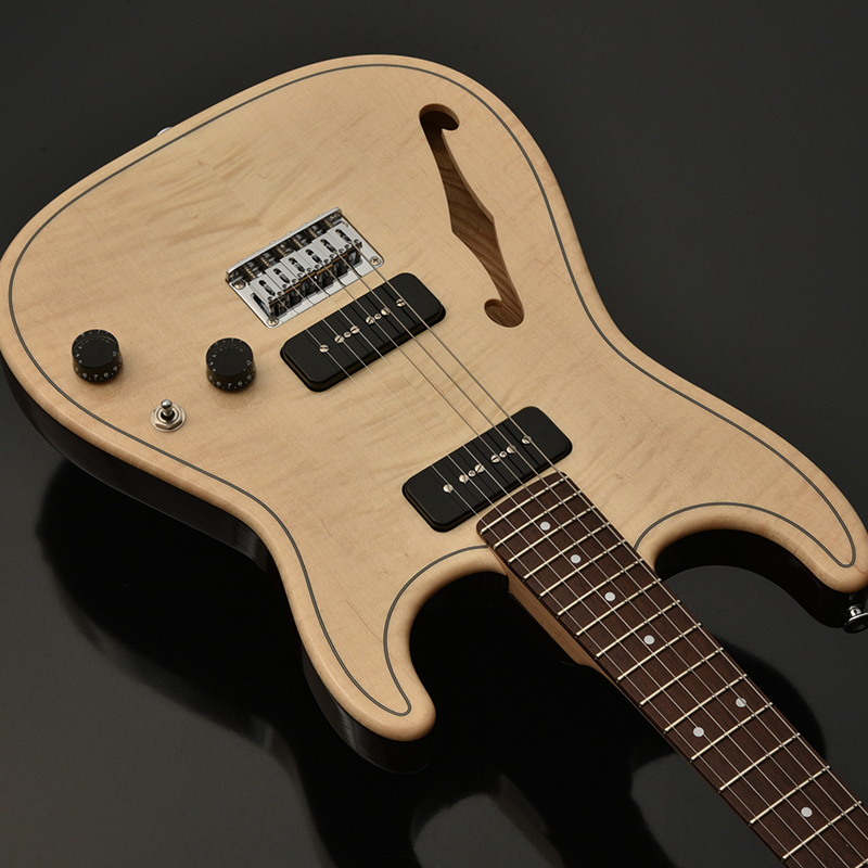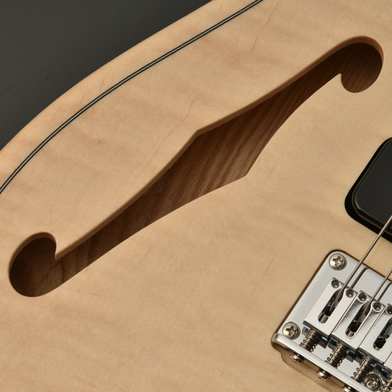 スッと筋が通った上品な見た目が特長的な材でありますが、一方で加工が難しいことでも知られ、飛鳥工場の熟練の技術をもってこそ、ギターの形に落とし込むことが出来ます。 楓は種別としてはハード・メイプルに分類され、こちらもパリッとしたミッドからハイ付近に特徴があるサウンドですが、ホロウ構造より生み出されるエアー感が加わり、柔らかくも抜けが良い響きはこのモデルにしか出せないものになりました。