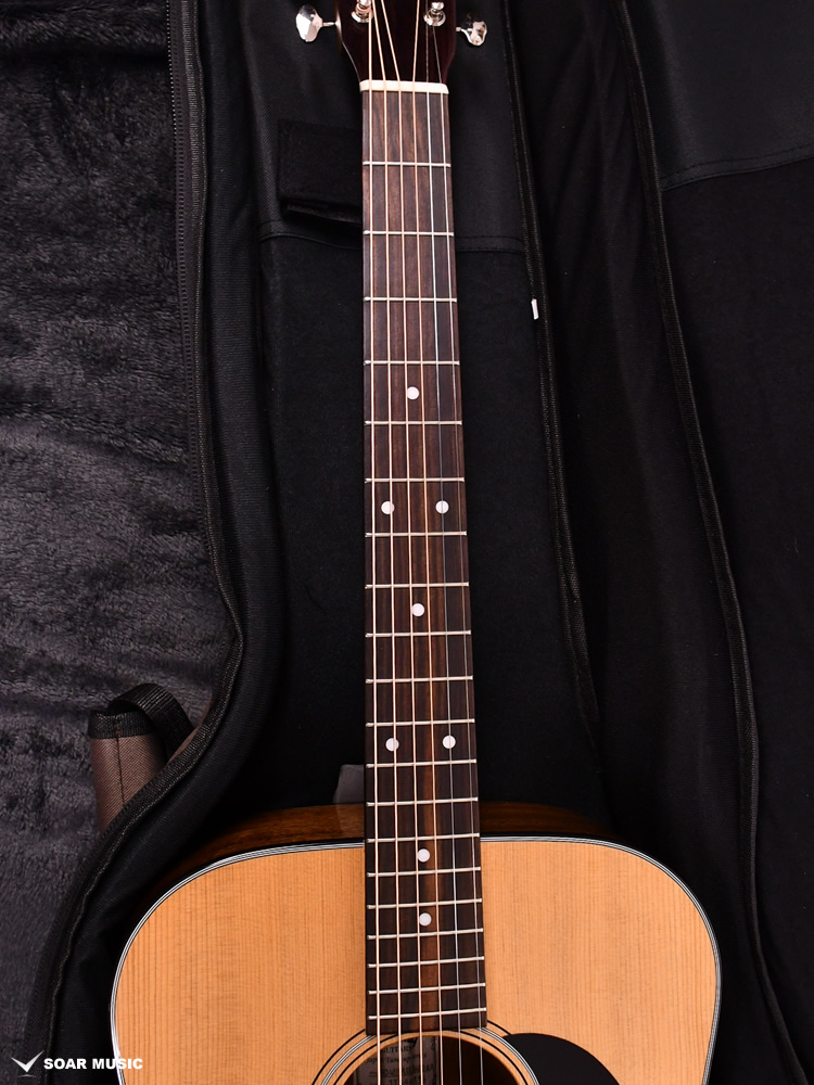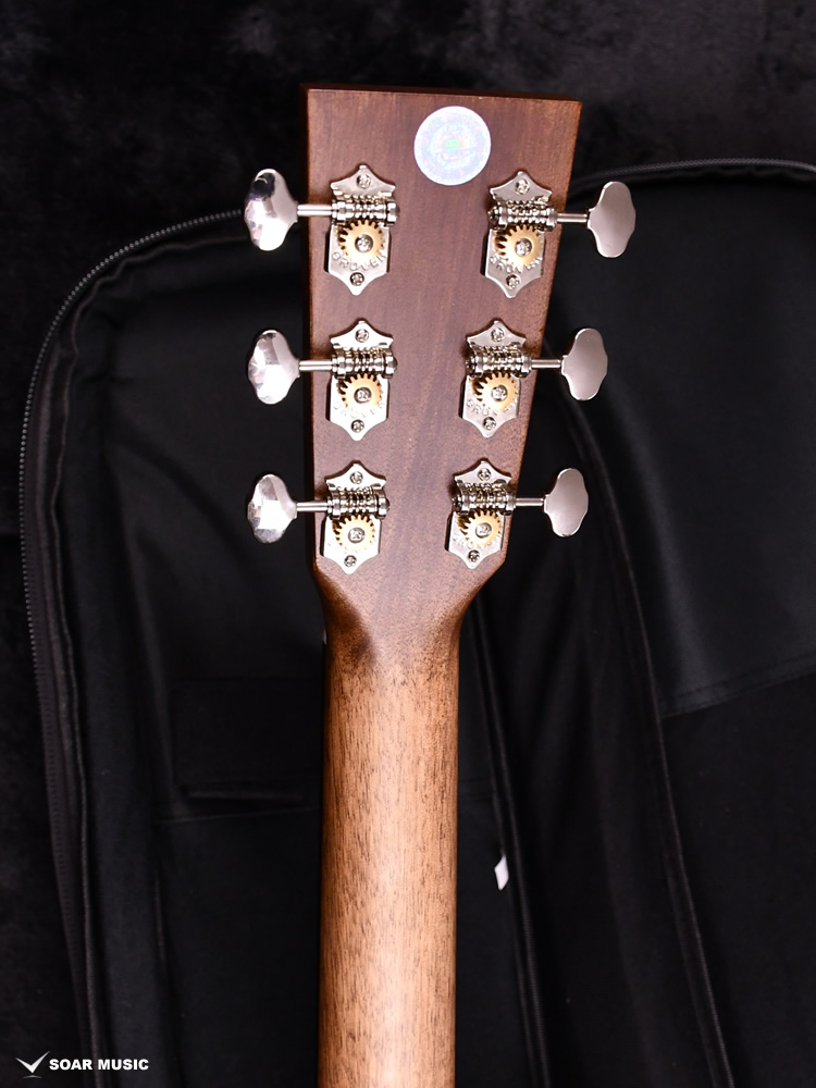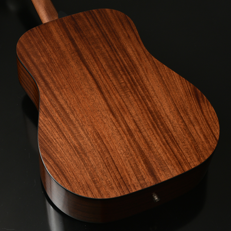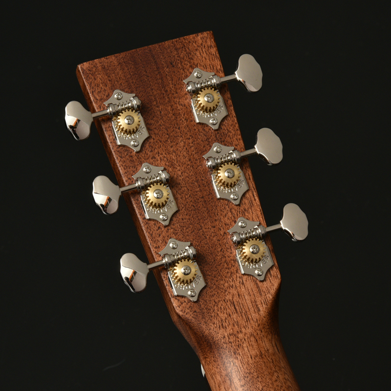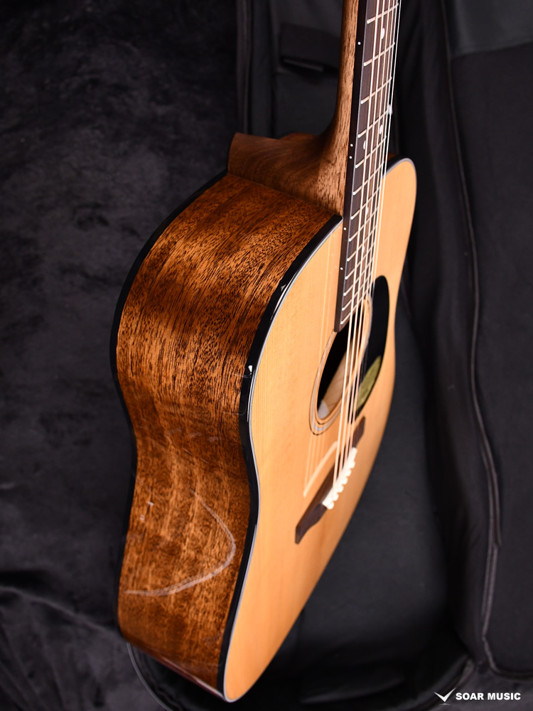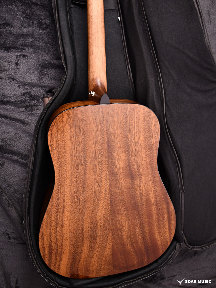 ボディトップはスプルース単板、ボディサイドバックはアフリカンマホガニー単板となっております。オール単板であるため、合板のギターと比べて木材の振動が豊かになり、より本格的なアコーステックサウンドを楽しめます。