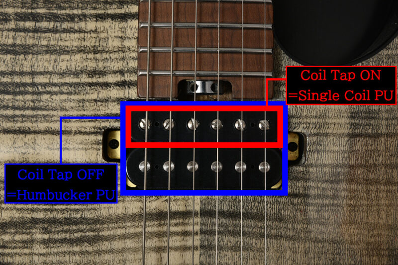 ハムバッカーは低音に寄った丸くパワフルなサウンドが特徴ですが、コイルタップスイッチで切り替えることで、シングルコイルさながらの歯切れのいいチャキチャキした繊細なサウンドも鳴らすことが可能になるのです。