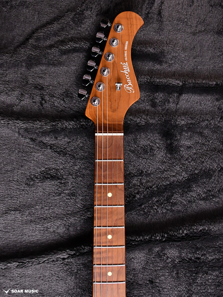 ローステッドメイプルとはメイプルを高温で加熱処理して材の中の水分や油分を揮発させることにより剛性を高めた材。ネックに使用されるとその効果は安定性だけでなくサウンドにも及び、豊かな生鳴りと経年変化したビンテージのようなこなれたトーンを生み出します。高級機種で使われることの多いこの本格派仕様をリーズナブルな価格帯に落とし込んだBacchusの新しい製品ラインナップです。