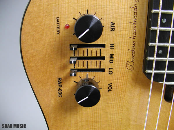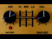 ピエゾピックアップとコンデンサーマイクによるデュアルピックアップをコントロールする新開発システムRAP-03C。3バンドEQに加え、コンデンサーマイクの出力を設定するAIRコントロールを搭載。 |