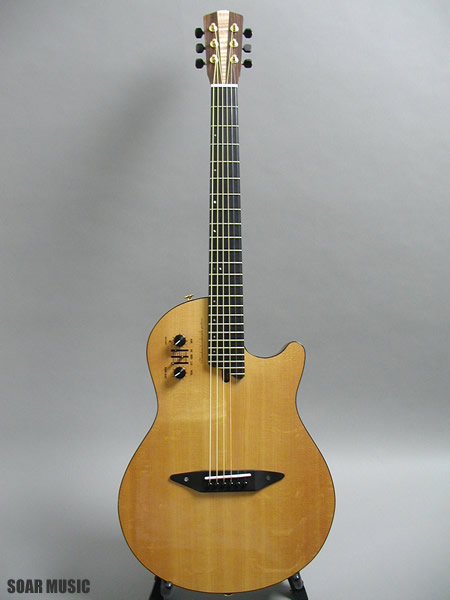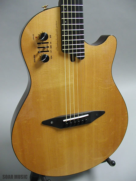 ピエゾピックアップとコンデンサーマイクの2系統のピックアップからなるコンパクト・エレアコ。ファクトリーが誇るギターマエストロ百瀬泰夫の長年のアコースティック製作の経験から生み出された独自のブレーシング構造を持ち、ハウリングを抑えたイージーな操作性を維持しつつも、十分な手応えのある生鳴りを両立。このタイプでは実現の難しかった豊なダイナミクスレンジを引き出しています。