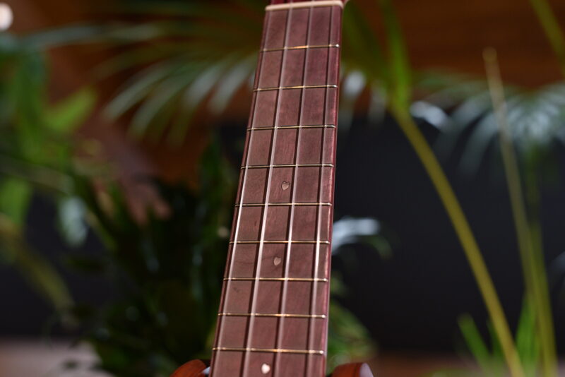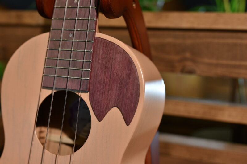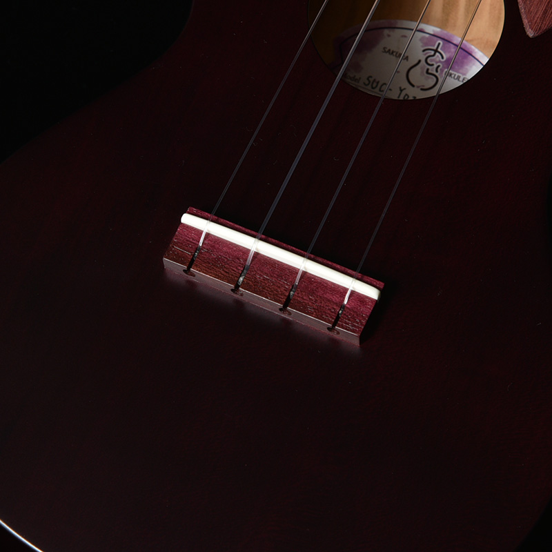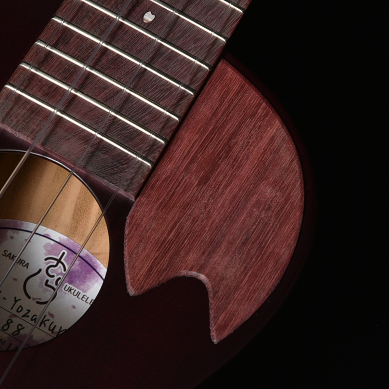 指板と同じPurpleheartを使用し、桜の花弁をモチーフとしたピックガードを採用。 このワンポイントがSAKURA UKULELEたる華やかさを演出するとともに、トータルデザインをまとめております。