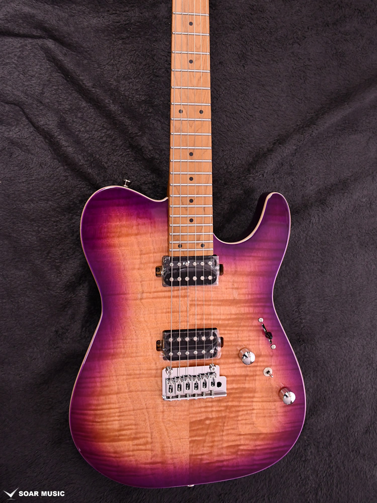 ボディトップに「フレイムマホガニー」を採用しております。フレイム杢が際立つようにボディセンターはナチュラルに仕上げ、バーストをかけることで上位機種にも引けを取らない華やかな外観に仕上がっています。
