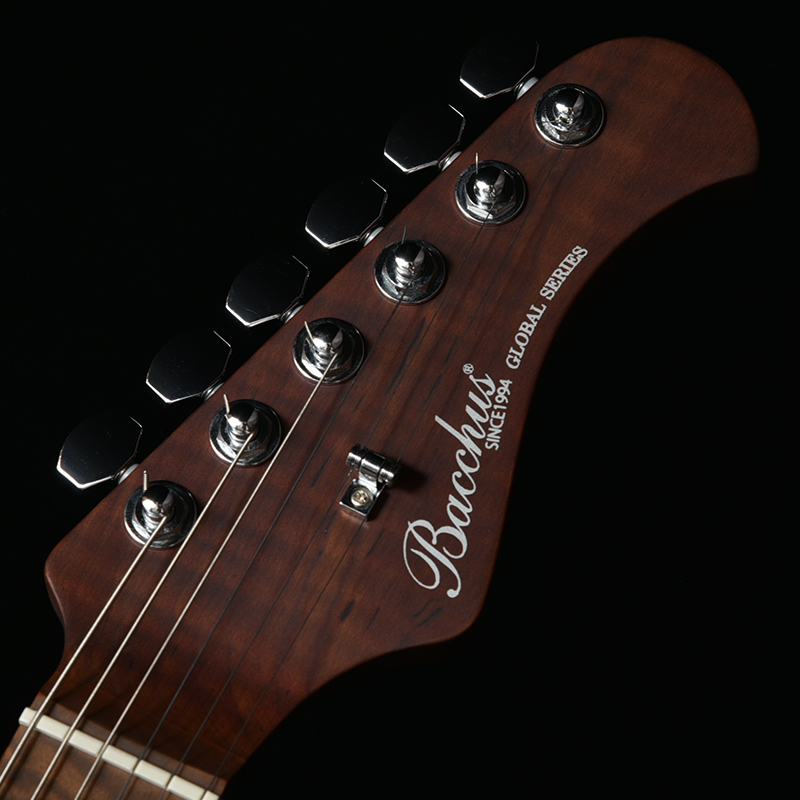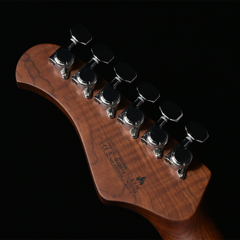 ローステッドメイプルとはメイプルを高温で加熱処理して材の中の水分や油分を揮発させることにより木材を経年変化した状態に人工的に近づけた材のことです。経年劣化が進んだ材は歪みやねじれが生じにくくなります。ネックに使用されるとその効果は安定性だけでなくサウンドにも及び、豊かな生鳴りと経年変化したビンテージのようなこなれたトーンを生み出します。一般的に高級機種などで用いられる材ですが、手に取りやすい価格帯に落とし込むことに成功しました。