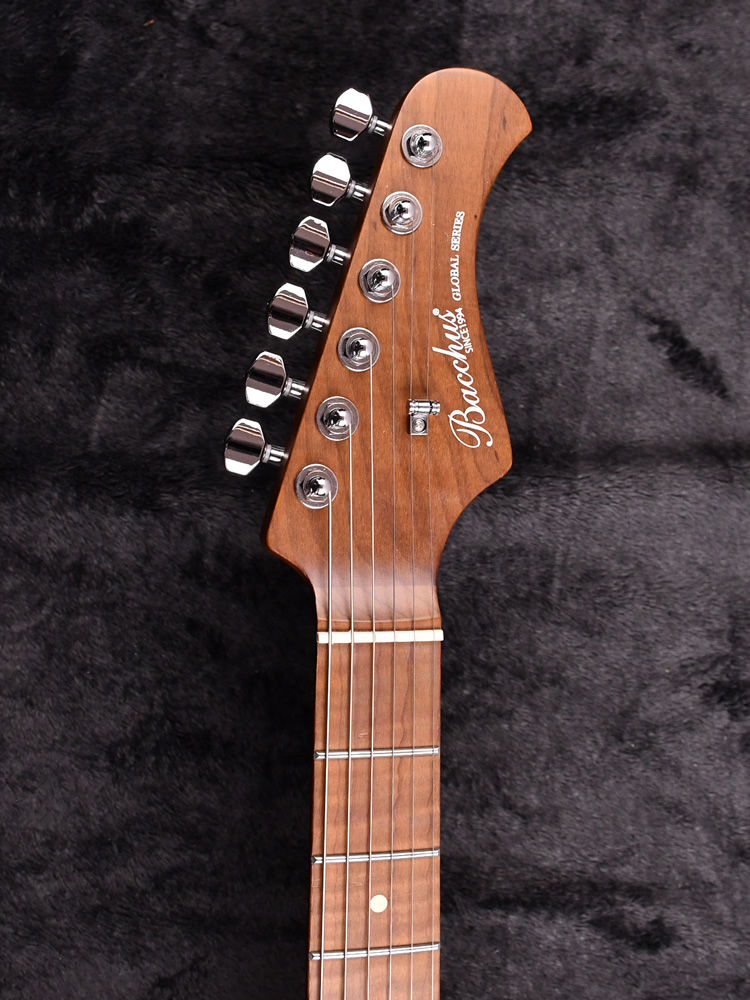 ネックにはBacchusの新機軸でもあるローステッドメイプルを採用。 ローストする工程上でゆがみが生じてしまうような木材はその時点で淘汰されるため、ネックとして搭載されている個体は非常にゆがみやねじれに強く、比較的手に取りやすい価格帯ながら長い間ご愛用できる仕様となっております。
