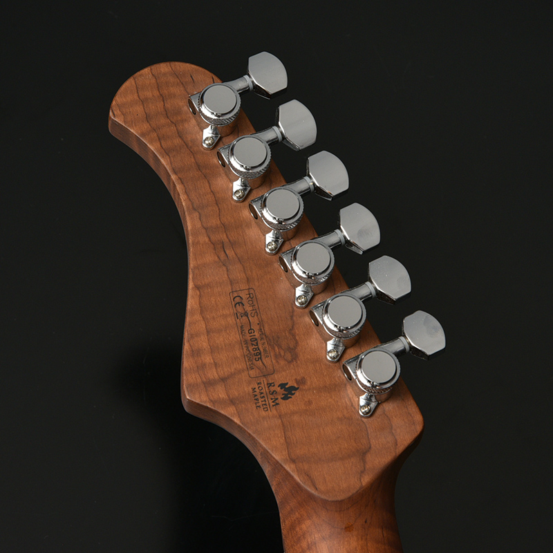 ローステッドメイプルとはメイプルを高温で加熱処理して材の中の水分や油分を揮発させることにより木材を経年変化した状態に人工的に近づけた材のことです。経年劣化が進んだ材は歪みやねじれが生じにくくなります。 ネックに使用されるとその効果は安定性だけでなくサウンドにも及び、豊かな生鳴りと経年変化したビンテージのようなこなれたトーンを生み出します。 一般的に高級機種などで用いられる材ですが、手に取りやすい価格帯に落とし込むことに成功しました。