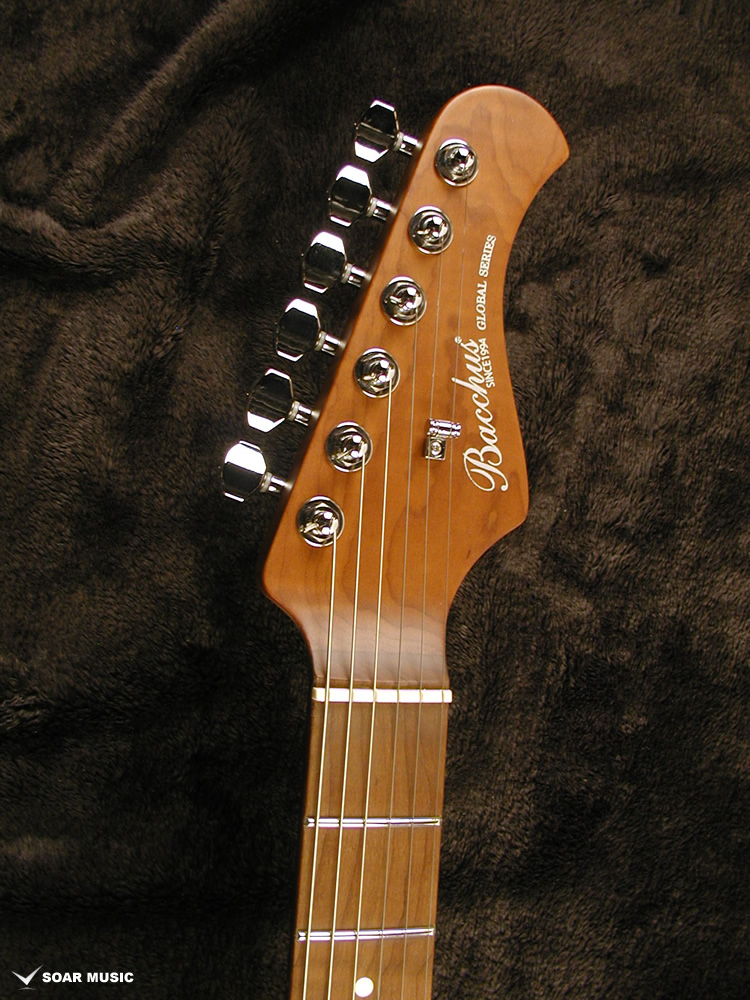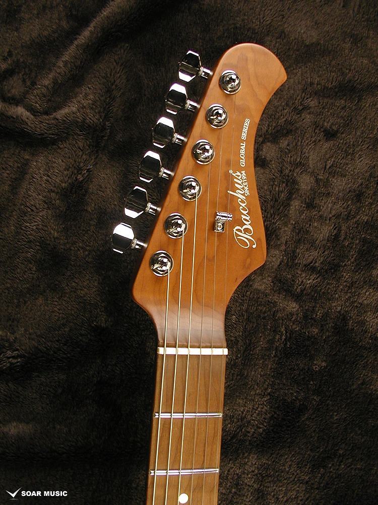 ネックにはBacchusの新機軸でもあるローステッドメイプルを採用。 ローストする工程上でゆがみが生じてしまうような木材はその時点で淘汰されるため、ネックとして搭載されている個体は非常にゆがみやねじれに強く、比較的手に取りやすい価格帯ながら長い間ご愛用できる仕様となっております。