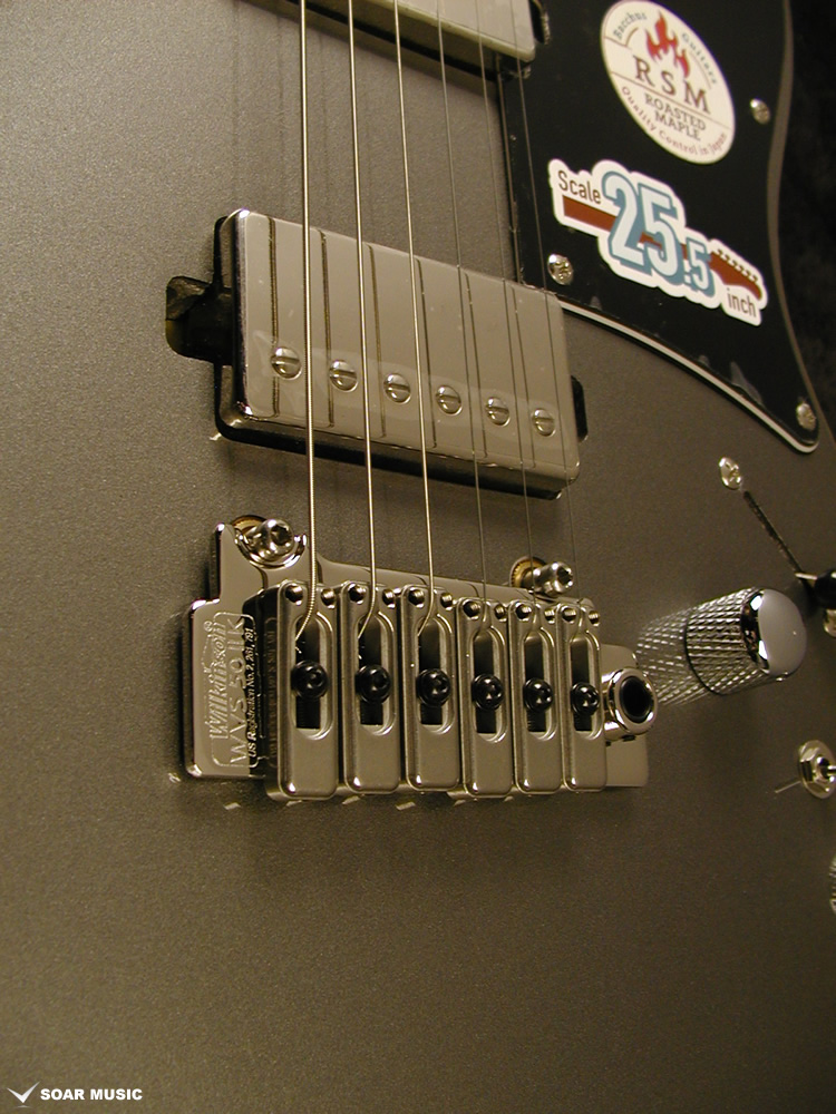 一般的なトレモロユニットはブリッジを支えるネジが6本使われていますが、本モデルは支点が左右2点のスタッドになったトレモロユニット『WILKINSON/WVS50IIK』を採用しています。 アーミングプレイ時の可動域が広く、ダウンはおよそ1.25音分、アップはおよそ1音分可動します。 また、アーミングによってテンションが変動しても2点にしか負荷がかからないため6点支持のトレモロユニットよりもチューニングが安定しやすいといった効果が望めます。