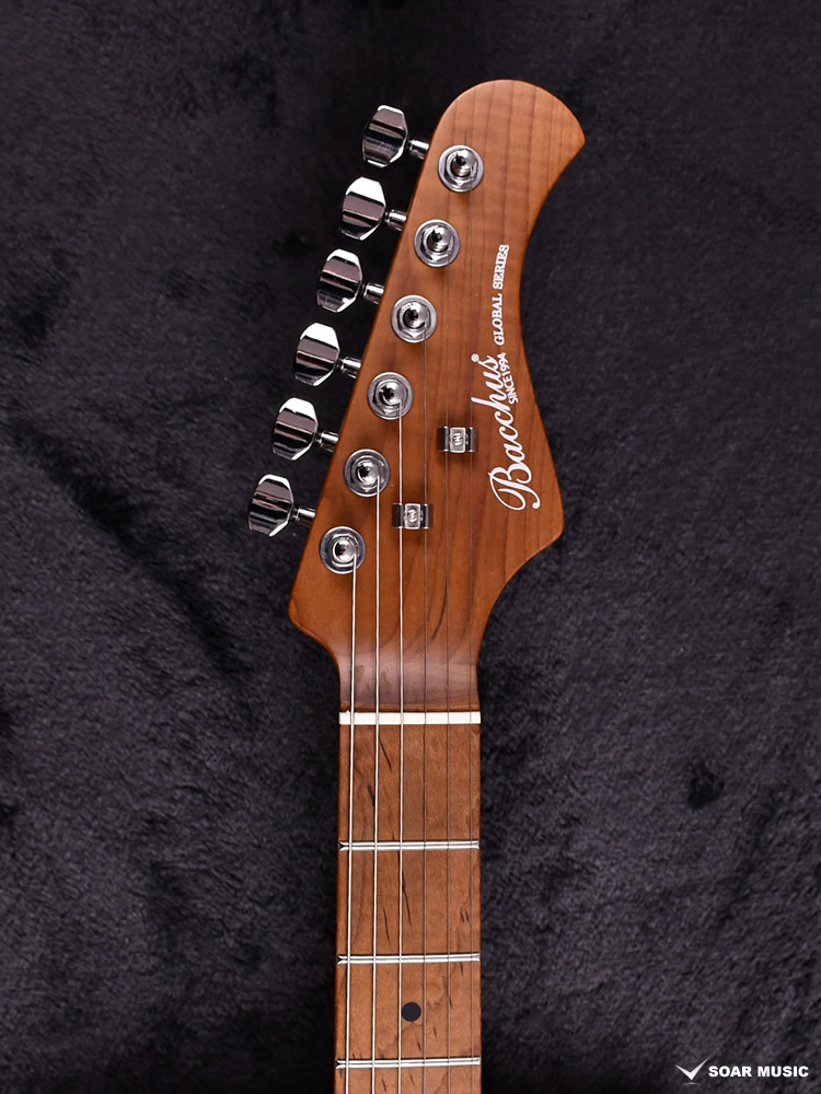 ローステッドメイプルとはメイプルを高温で加熱処理して材の中の水分や油分を揮発させることにより剛性を高めた材。ネックに使用されるとその効果は安定性だけでなくサウンドにも及び、豊かな生鳴りと経年変化したビンテージのようなこなれたトーンを生み出します。高級機種で使われることの多いこの本格派仕様をリーズナブルな価格帯に落とし込んだBacchusの新しい製品ラインナップです。