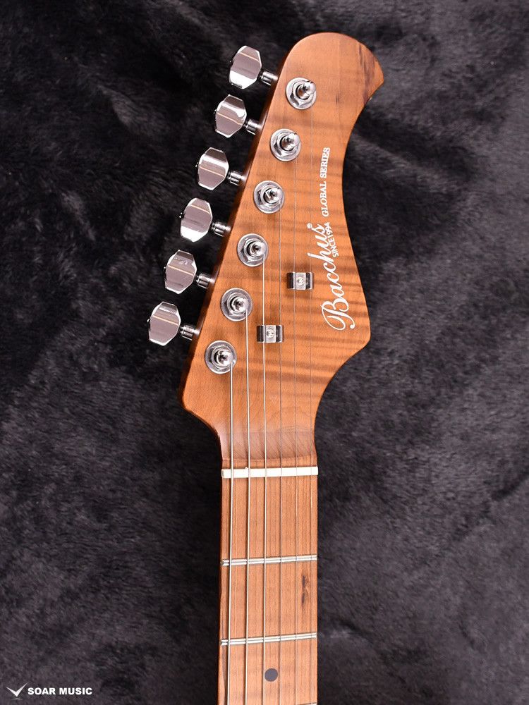 ローステッドメイプルとはメイプルを高温で加熱処理して材の中の水分や油分を揮発させることにより剛性を高めた材。ネックに使用されるとその効果は安定性だけでなくサウンドにも及び、豊かな生鳴りと経年変化したビンテージのようなこなれたトーンを生み出します。高級機種で使われることの多いこの本格派仕様をリーズナブルな価格帯に落とし込んだBacchusの新しい製品ラインナップです。
