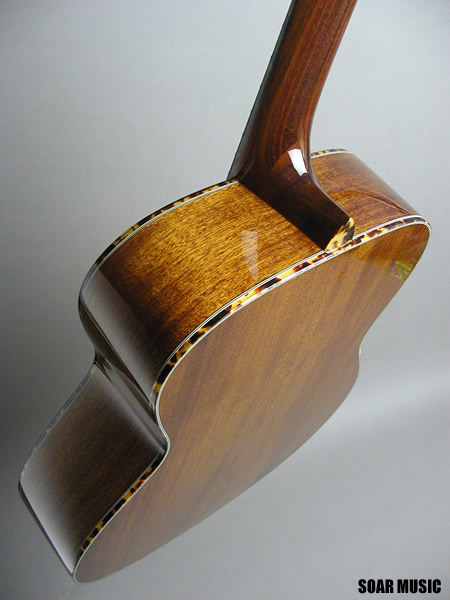 トーチインレイの施されたミニマムヘッド、べっ甲柄のセルバインディング、サウンドホール周りに装飾された