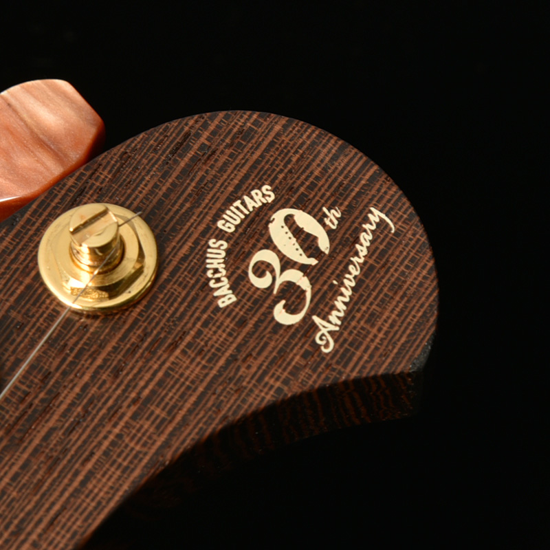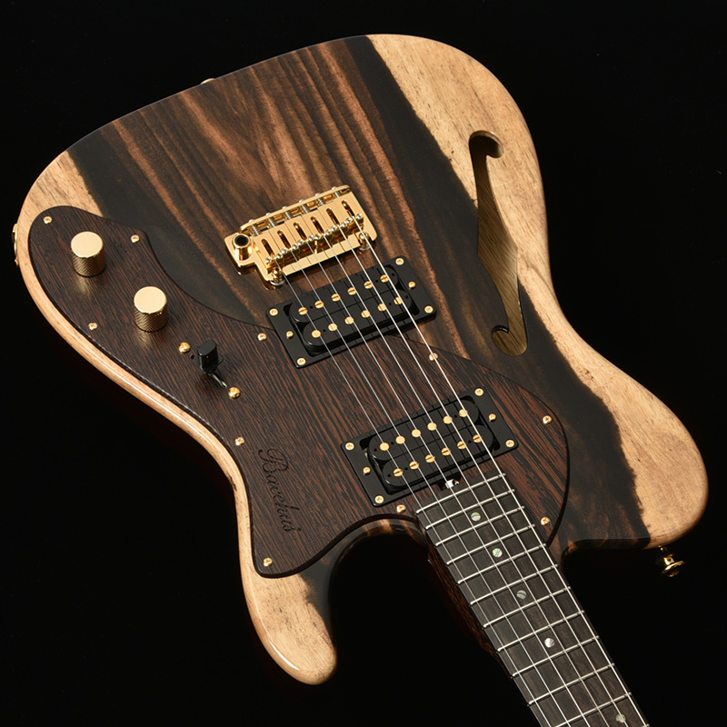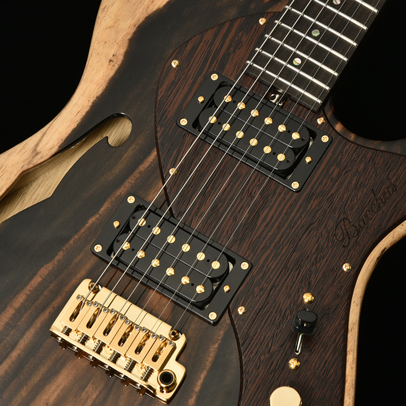 Bacchusの30周年を記念して、最上位機種 T-HOLLOW がプレミアムコレクションに登場。柿の木の中でも樹皮に含まれるタンニンの成分によって黒化した部分の割合が多い個体を特にクロガキと称します。太く存在感のある木目が、唯一無二のデザインとして現代のギターに宿りました。高級家具や建材として珍重されてきた希少材でもあり、黒を基調とした木目からナチュラルな仕上げとよくマッチします。