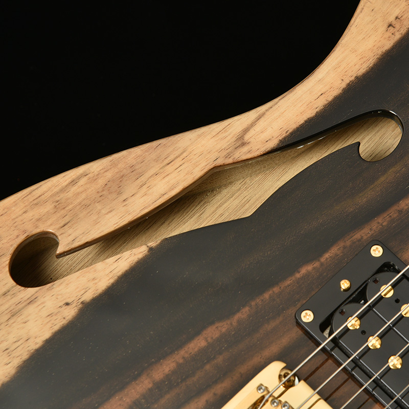 本モデルはレギュラー仕様にはない、Fホールを配したセミホロウ構造を採用。本体重量の軽量化による取り回しの良さと豊かな生鳴りを獲得しています。