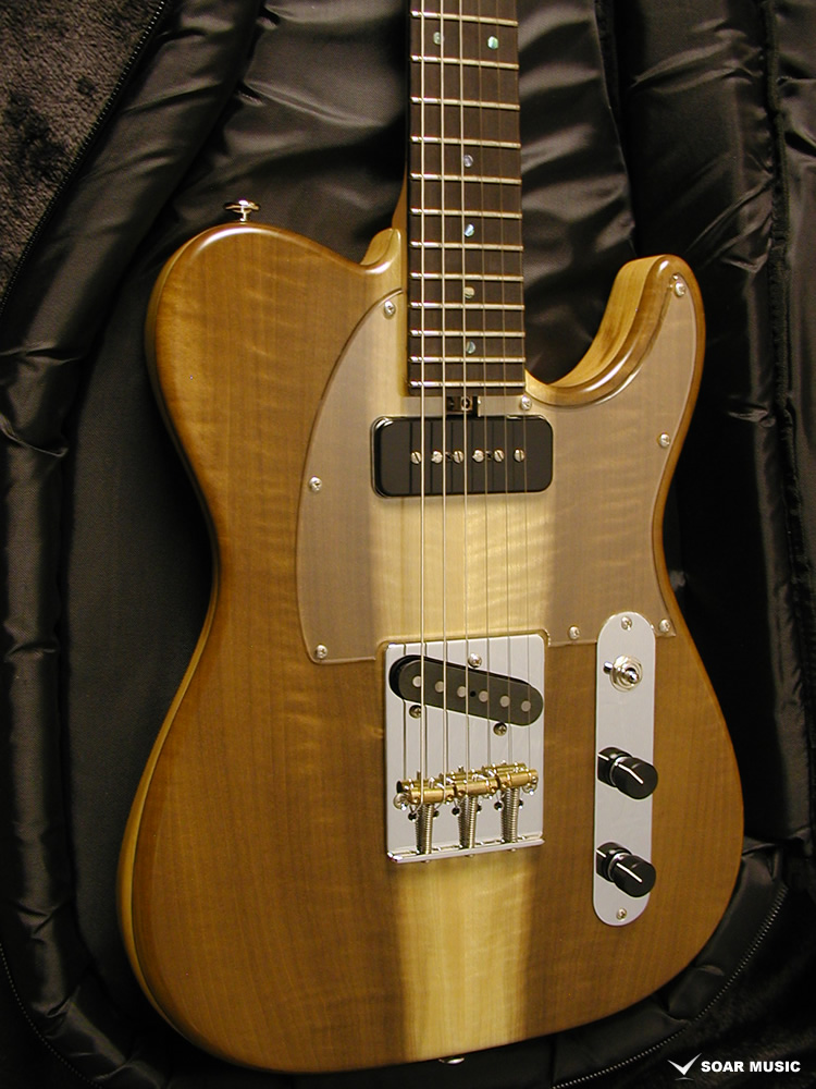 Bacchus Handmade SeriesのテレキャスタータイプT-MASTERモデルを基に、エキゾチックウッドを使用してカスタム製作された限定モデルです。ボディ・ヘッドトップには独特の色合いでフレイムの入ったレア和材のホオノキ(マグノリア)を使用。杢目を邪魔しないクリアピックガード仕様にカスタムされています。フロントにP-90を搭載した2ピックアップ仕様でピックアップにはアメリカ製ハンドワイヤリングのMOJO TONEピックアップを搭載しています。ブリッジには裏通しだけではなく、トップロードも可能なブラスサドルのGOTOH BS-TC2を搭載。エキゾチックな杢目だけではなく、材の性質を活かしたサウンドバランス、高い木工技術による丁寧な造りなど、