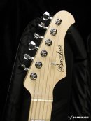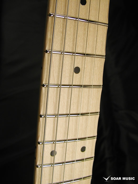 ネックは十分にシーズニングが行われたメイプル材を使用し、削る毎に変化する材の状態・性質を見極めて適切な加工を行い、また、各工程の合間に材を寝かせて十分な狂い出しを行う事で、長くお使いいただける高い安定性と剛性を備えています。ネック裏はサラサラとした手触りのサテンフィニッシュで仕上げられており、指板サイドにはサイドスキャロップ加工が施されており、スムーズな演奏性を実現。また、ネックグリップは太過ぎないUシェイプで、指板は280Rで形成されており、弦高低めのセットアップでのチョーキング(ベンディング)の際の音詰まりの改善だけではなく、バレーコード等の押さえ易さやネックを握り込んで演奏するウエスタングリップのスタイルでも違和感なく手に馴染む心地よいフィット感があります。