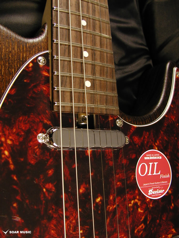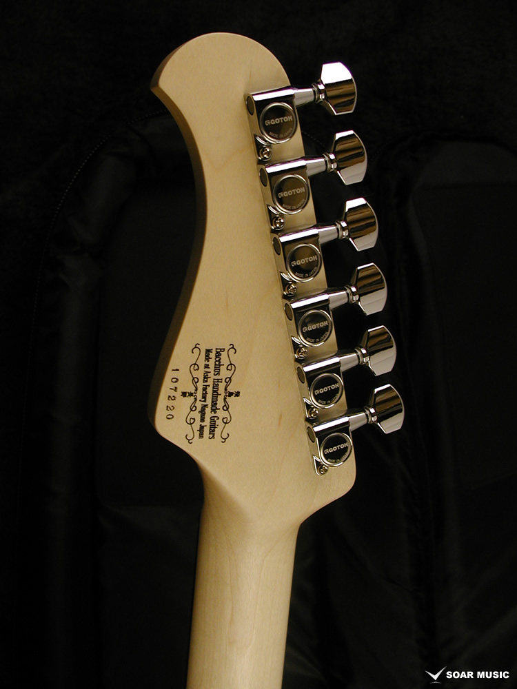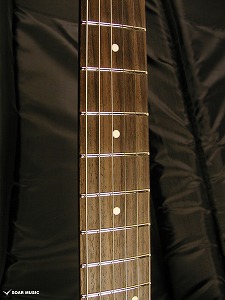 ネックは十分にシーズニングが行われたメイプル材を使用し、削る毎に変化する材の状態・性質を見極めて適切な加工を行い、また、各工程の合間に材を寝かせて十分な狂い出しを行う事で、長くお使いいただける高い安定性と剛性を備えています。ネック裏はサラサラとした手触りのサテンフィニッシュで仕上げられており、指板サイドにはサイドスキャロップ加工が施されており、スムーズな演奏性を実現。また、ネックグリップは太過ぎないUシェイプで、指板は280Rで形成されており、弦高低めのセットアップでのチョーキング(ベンディング)の際の音詰まりの改善だけではなく、バレーコード等の押さえ易さやネックを握り込んで演奏するウエスタングリップのスタイルでも違和感なく手に馴染む心地よいフィット感があります。