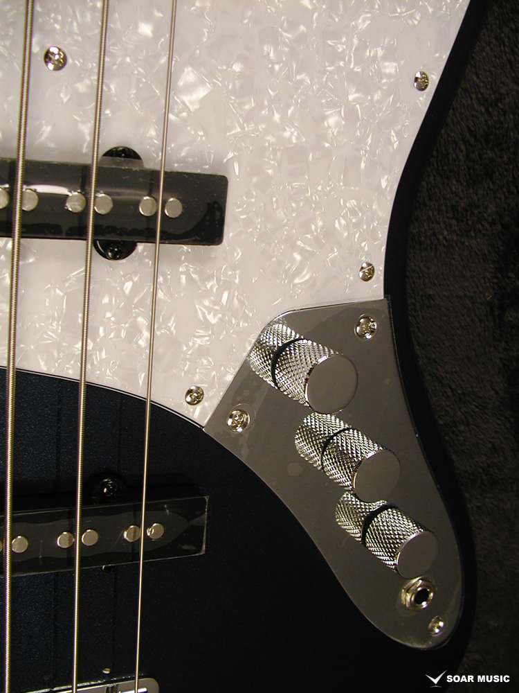 コントロール部分はスタンダードなジャズベースと同様、フロントピックアップボリューム、リアピックアップボリューム、マスタートーンとなり、シンプルで扱いやすい仕様です。 トーンコントロールはノブを絞ると徐々に高音域がカットされ、ピックアップポジションを問わずより低音域が前面に出たブーミーなサウンドになります。