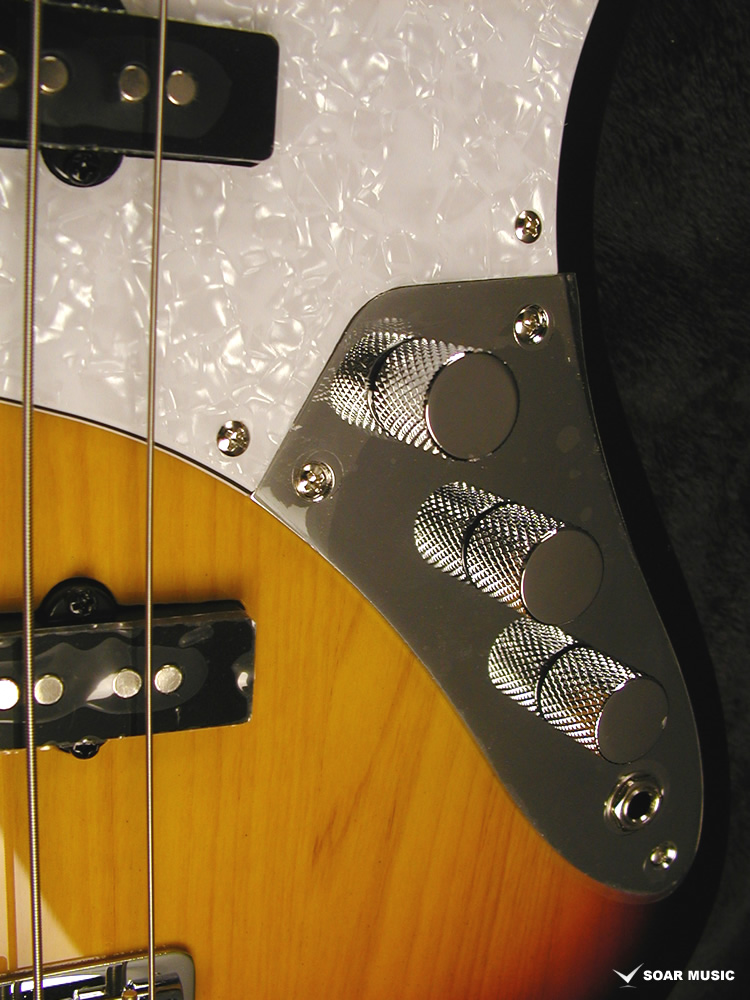 コントロール部分はスタンダードなジャズベースと同様、フロントピックアップボリューム、リアピックアップボリューム、マスタートーンとなり、シンプルで扱いやすい仕様です。 トーンコントロールはノブを絞ると徐々に高音域がカットされ、ピックアップポジションを問わずより低音域が前面に出たブーミーなサウンドになります。