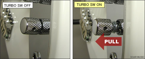 通常の2ピックアップタイプのベースはフロントピックアップ、 リアのピックアップをパラレル(並列)で配線してますが、 WJB-500 はターボスイッチを搭載しており、 トーンノブを引っ張るとフロント/リアピックアップを連動させたシリーズ(直列)回路に 切り替わり、出力がアップします。 ターボON (シリーズ)時はフロント/リアピックアップが 連動し、ハムバッキングタイプの ピックアップになり、フロントピックアップの ボリュームノブで音量調節が可能になります。 ベースソロや、ベースラインを目立たせたい場所などで使うと非常に効果的です。