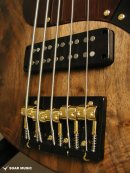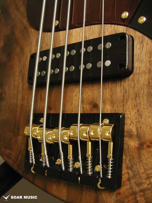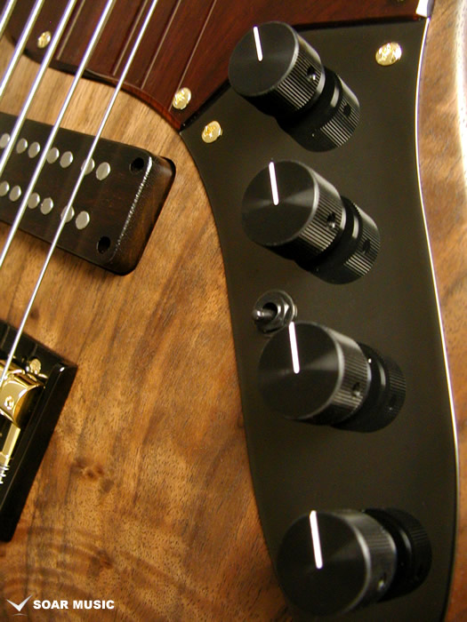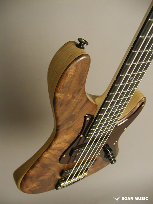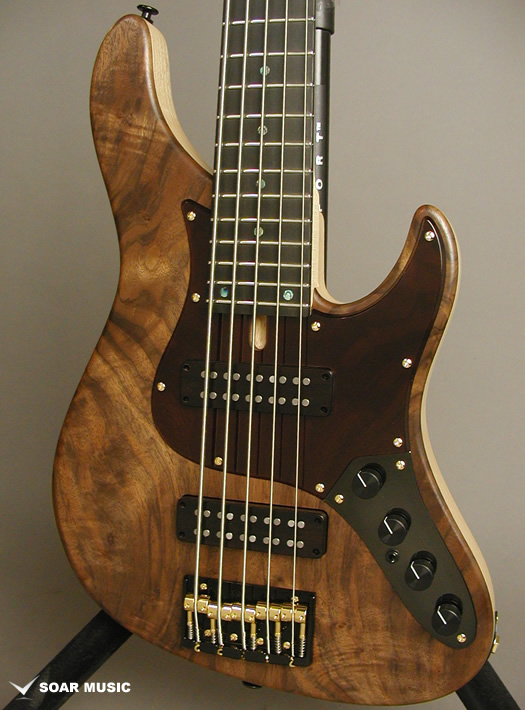 アッシュ2ピースボディのトップに木目が美しいクラロウォールナットを配した特別モデルを製作。Black & Goldのコンビネーションブリッジを採用するなど、高級感のあるルックスで個性的な一本です。プリアンプにアギュラーOBP-2を搭載、2バンドイコライザーでダイナミックな音作りが可能です。 |