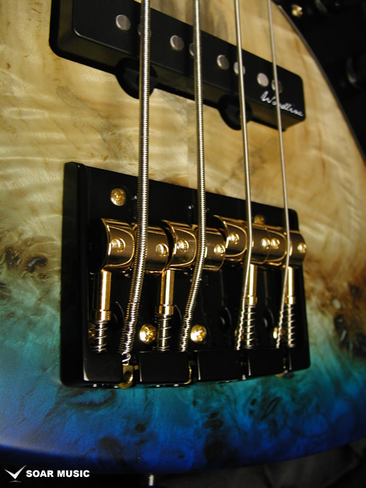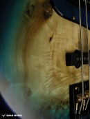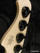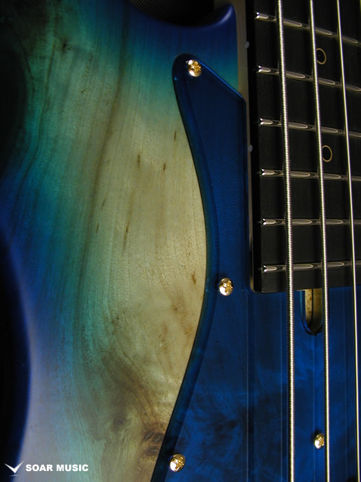 今回のモデルは、ボディトップに「バールポプラ」を採用しました。木の根付近の材は瘤杢(こぶもく)が多く見られ、生命力に満ちたその外観は、見るものを惹きこむ力があります。バールポプラの杢を活かすバーストカラーで仕上げました。各ボディカラーに合わせたピックガードを採用しており、ポジションマークにはブラスリングを採用しています。パーツカラーはBLACK & GOLDを採用し、高級感あふれる上質なモデルに仕上がっています。 |