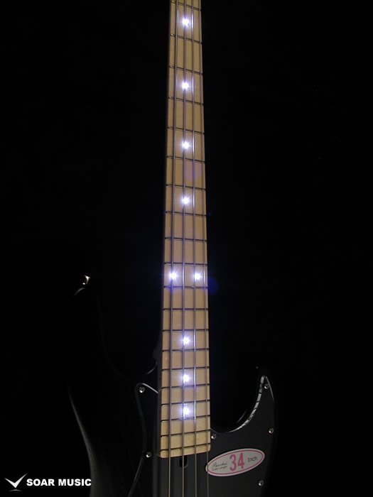 また、アッシュ材の木目が映えるオイルフィニッシュで塗装や外観を損なわないクリアピックガードの搭載など、指板のLEDだけではなく、ボディ側にも十分な個性を持たせた仕上がりになっています。ネックジョイント部分にはスラントカット加工が施されており、ヒール部分のハイポジションでの演奏ストレスを軽減します。