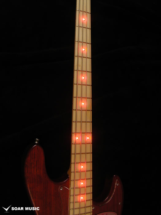 また、アッシュ材の木目が映えるオイルフィニッシュで塗装や外観を損なわないクリアピックガードの搭載など、指板のLEDだけではなく、ボディ側にも十分な個性を持たせた仕上がりになっています。ネックジョイント部分にはスラントカット加工が施されており、ヒール部分のハイポジションでの演奏ストレスを軽減します。