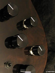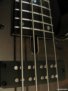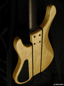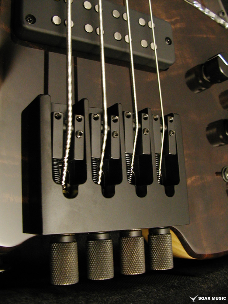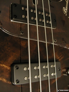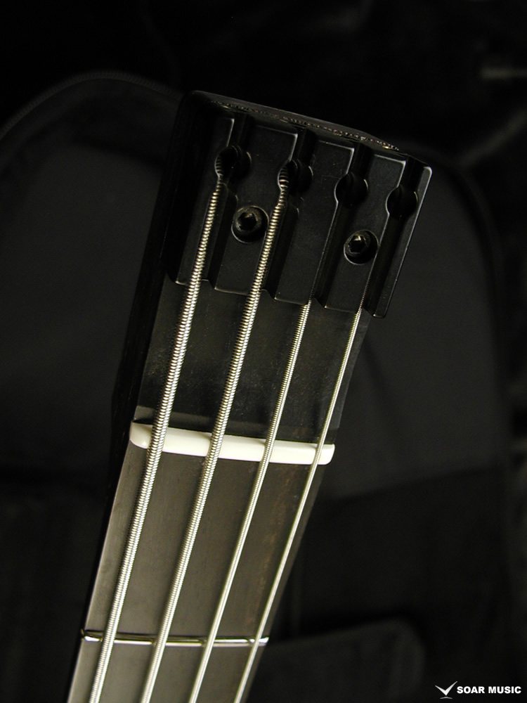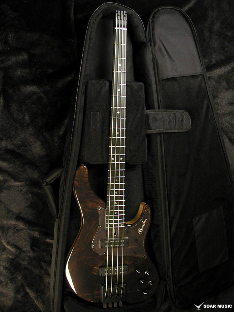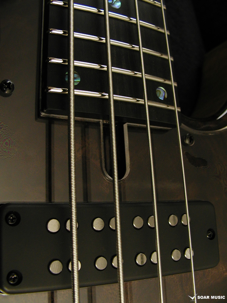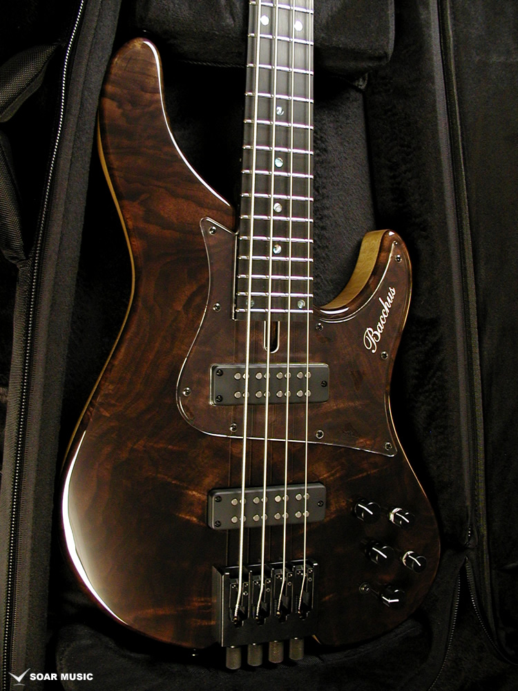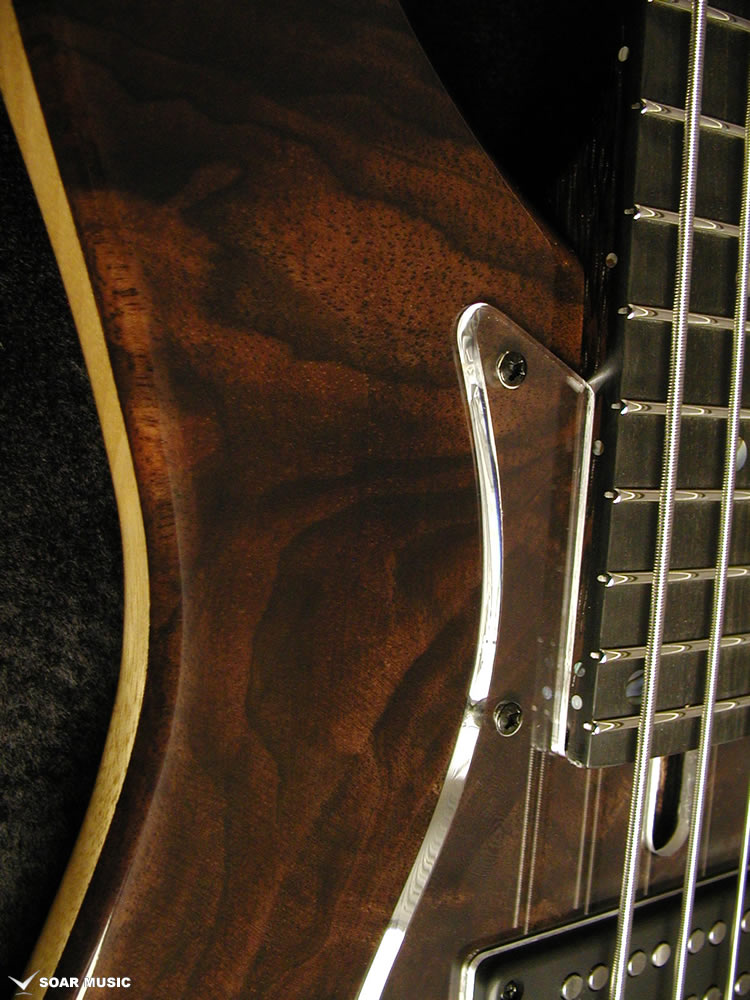 クラロウォルナットをトップに採用した特別仕様のヘッドレスベース。プリアンプには Aguilar/OBP-2 を搭載。